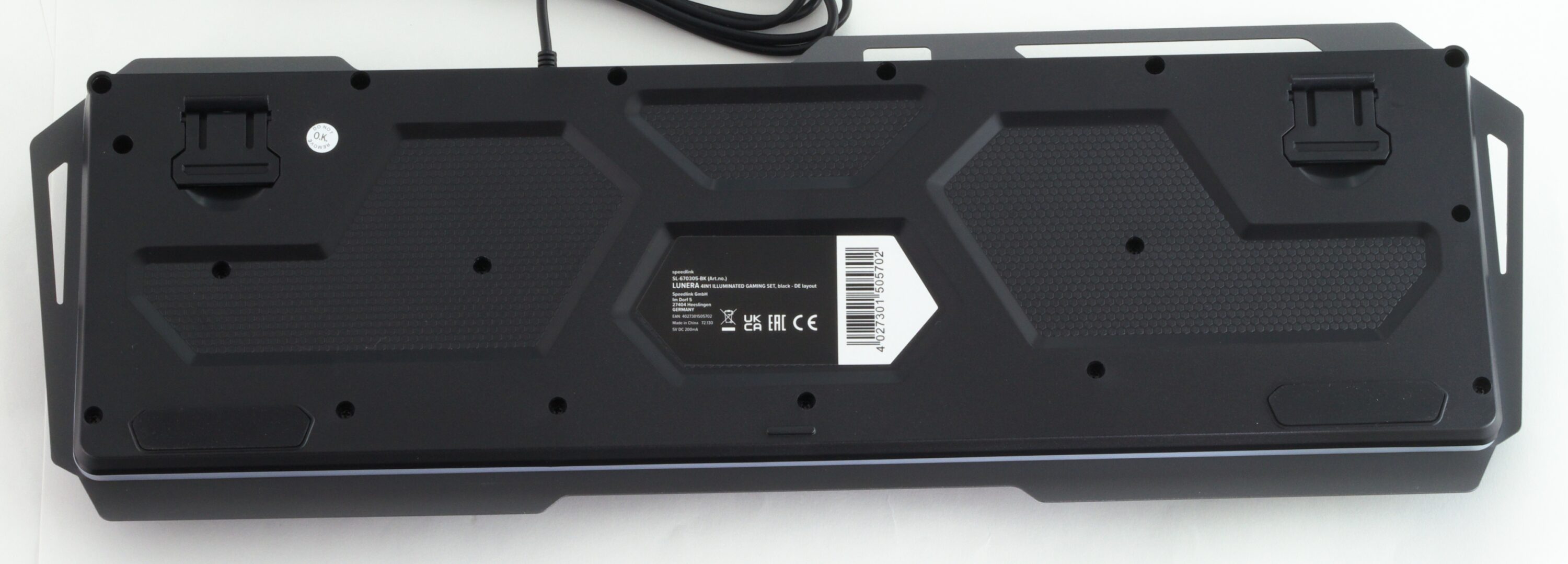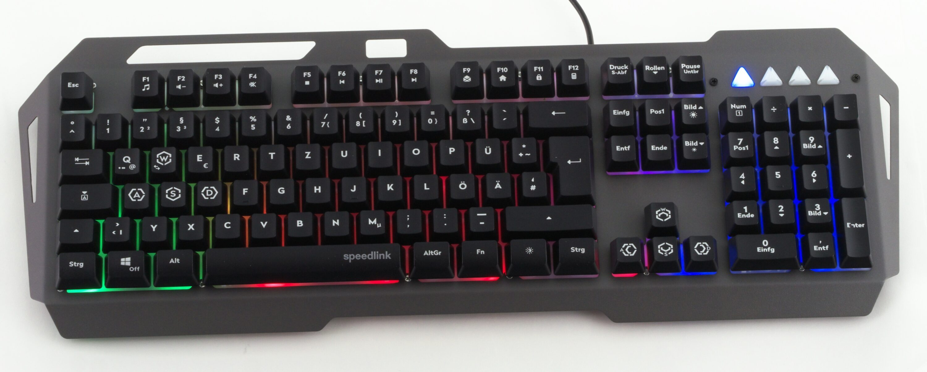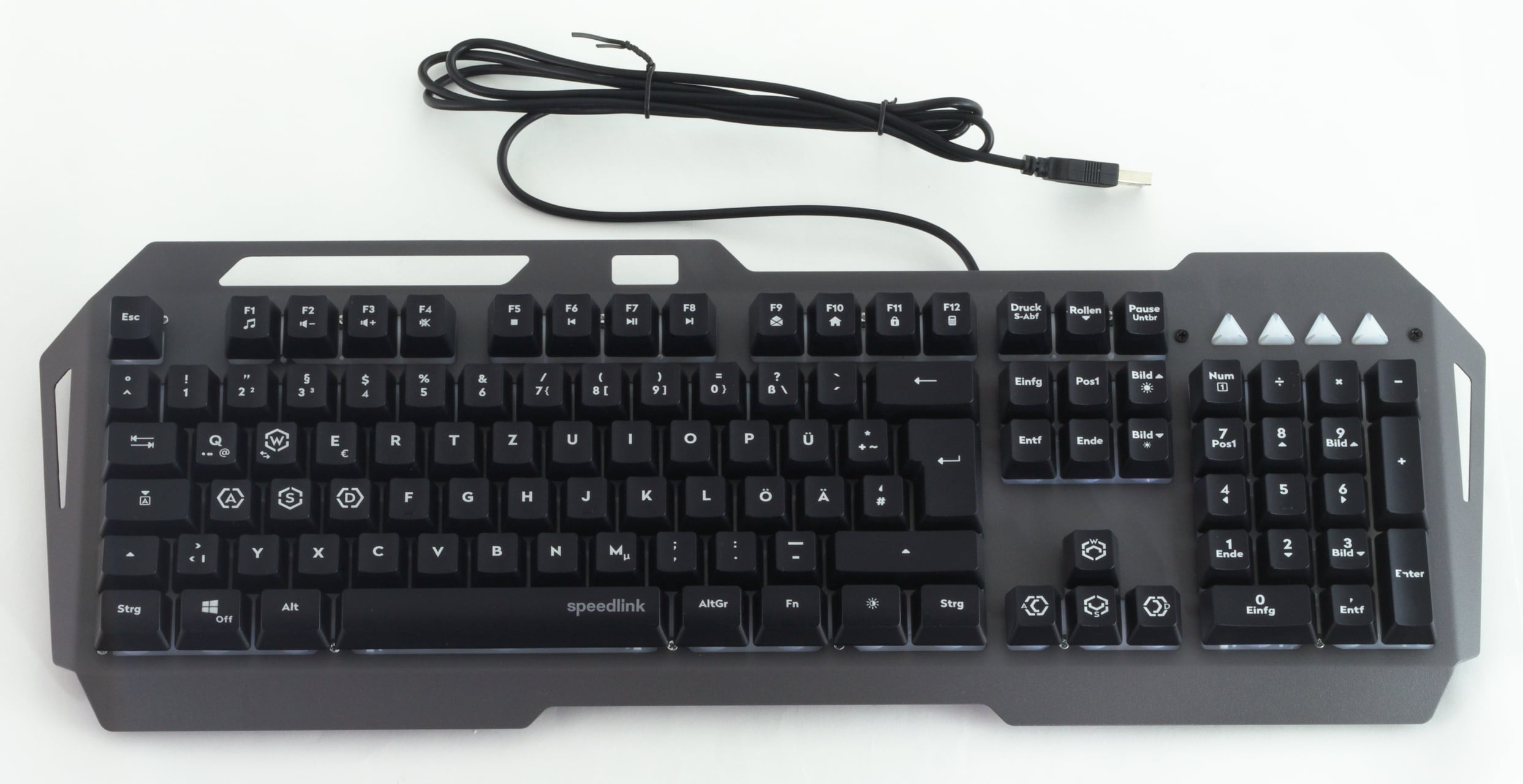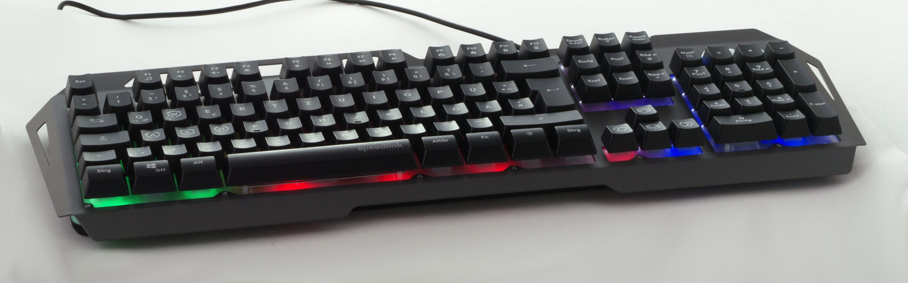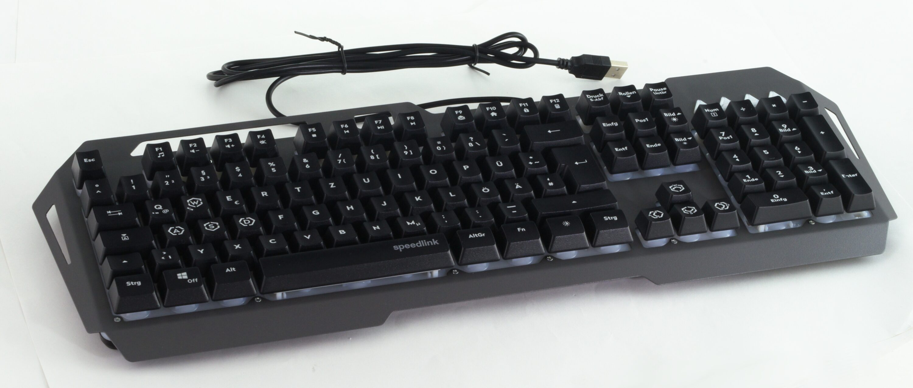 Die Tastatur setzt auf ein 100%-Standardlayout ohne Zusatztasten. Spezialfunktionen werden stattdessen durch eine FN- und eine Beleuchtungs-Taste realisiert. So kann man beispielsweise Einstellungen an der Musikwiedergabe vornehmen, die Windows-Taste sperren oder die Beleuchtung konfigurieren. Bei dieser setzt Speedlink dabei auf einige LEDs im Gehäuse, die den weißen, leicht transparenten Kunststoff unterhalb der Tasten anleuchten und somit zwar keine homogene Ausleuchtung erzielen, aber doch zumindest den gesamten Bereich anleuchten.