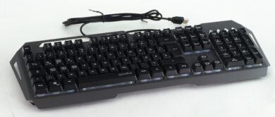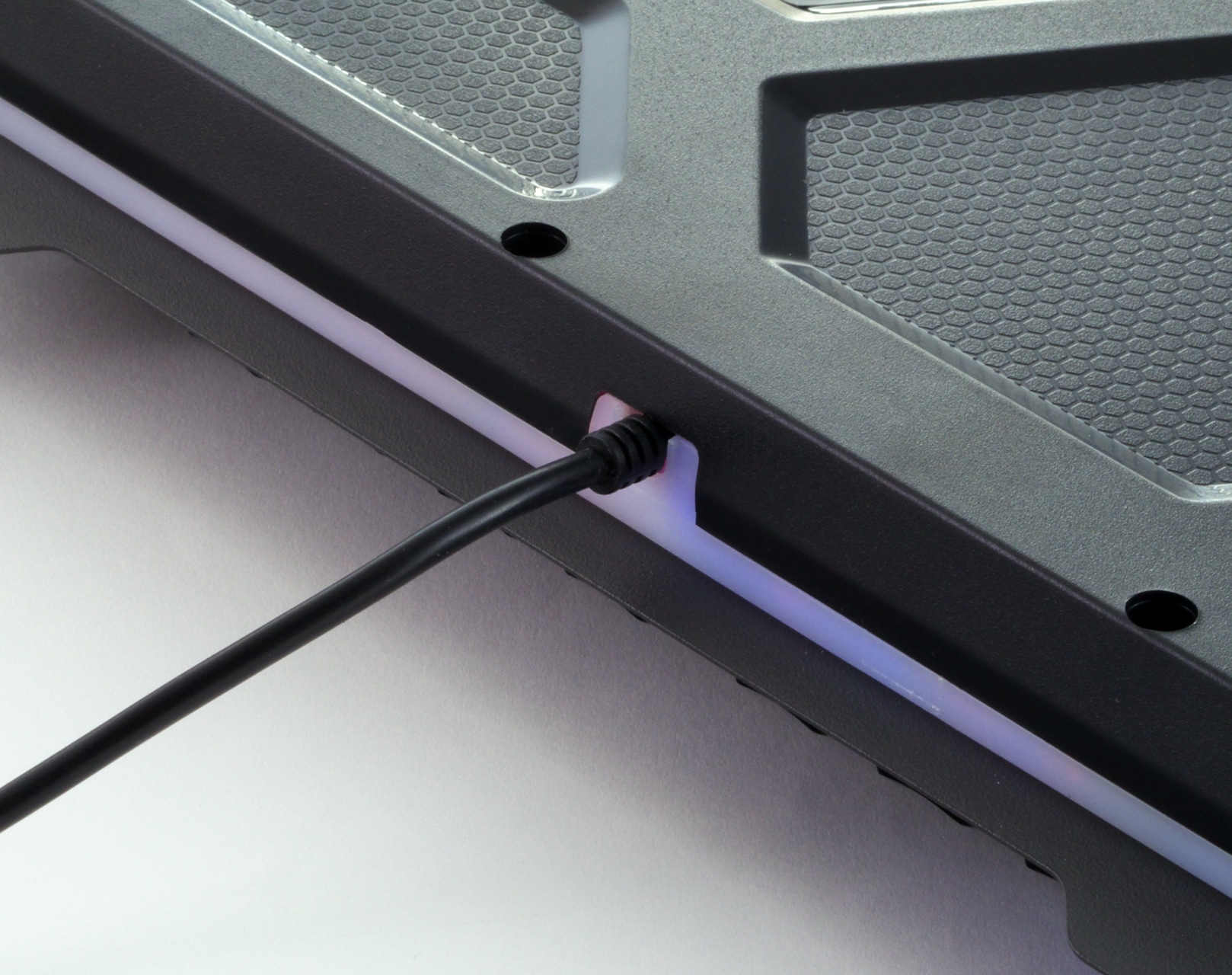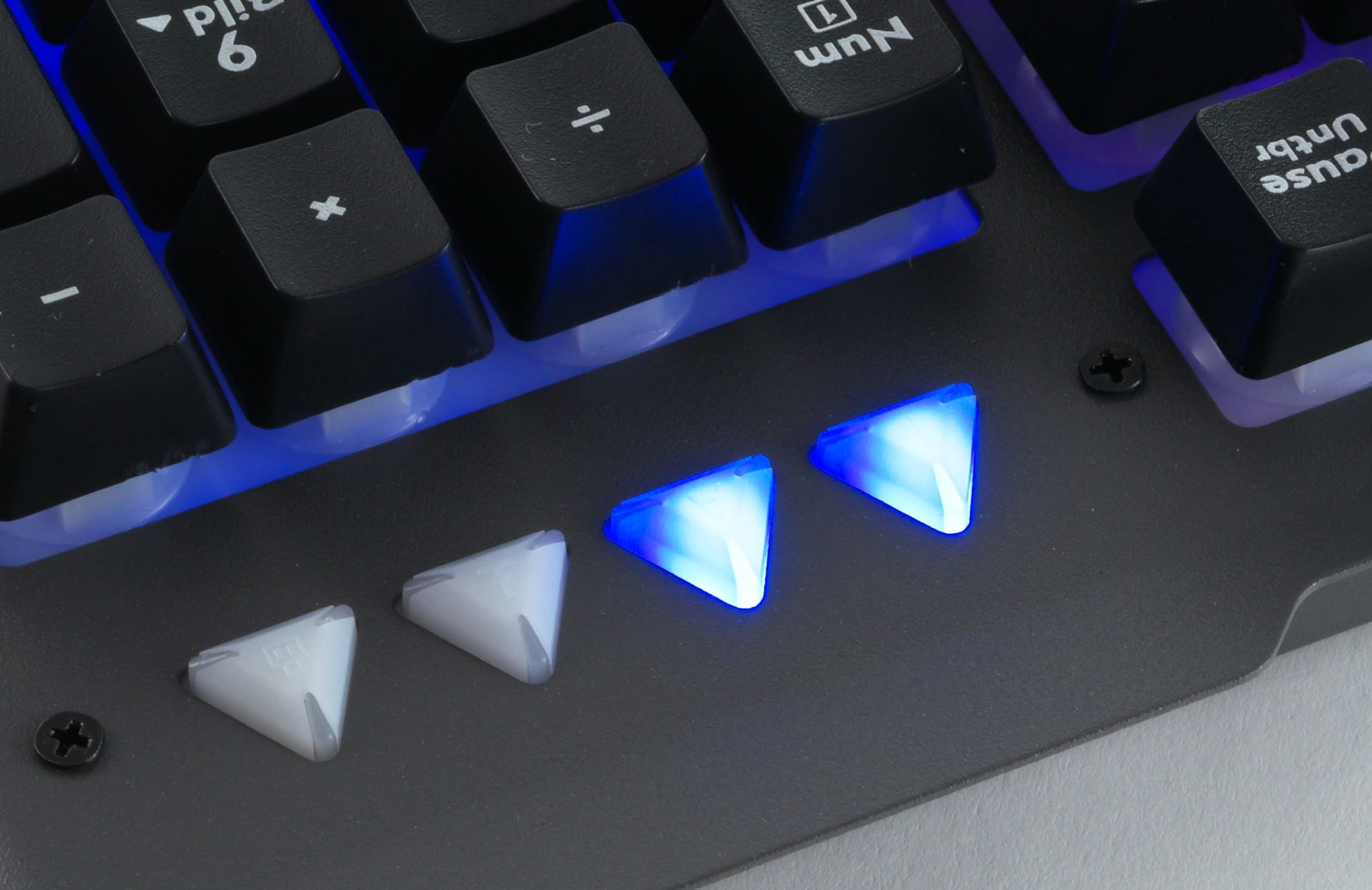 Als Tastatur gibt es im Lunera-Set ein typisches Rubberdome-Modell mit mehrfarbiger Hintergrundbeleuchtung. Das Gehäuse besteht dabei größtenteils aus mattschwarzem Kunststoff, die von oben sichtbare Abdeckung mit den Verzierungs-Ausschnitten besteht aber aus Metall. Die Verarbeitungsqualität ist dabei akzeptabel: Biegt man die Tastatur absichtlich, so knarzt sie merklich, und das Metallblech ist recht dünn. Große Mängel konnten wir an dem Gerät aber keine finden – einzig die Beschriftung der Enter-Taste im Nummernblock ist bei unserem Modell nicht ganz vollständig.