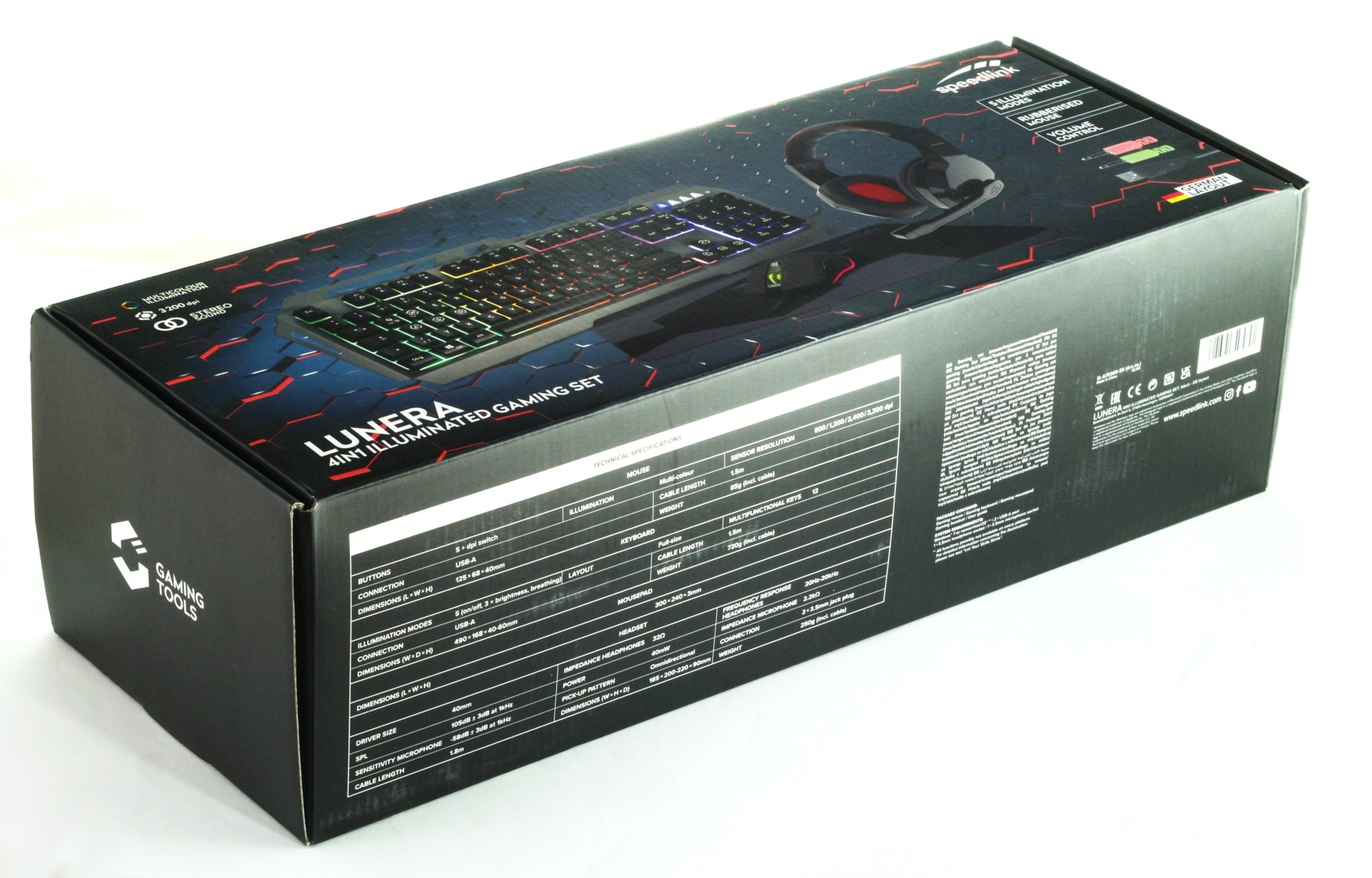 Speedlinks Lunera-Kit wird in einem großen, bunt bedruckten Karton geliefert. In dessen Inneren befindet sich ganz oben die Tastatur, darunter das Mauspad und ganz unten Maus und Headset. Auf Zubehör wird dabei weitgehend verzichtet: Abseits der jeweiligen Geräte gibt es lediglich noch zwei kurze Anleitungen.