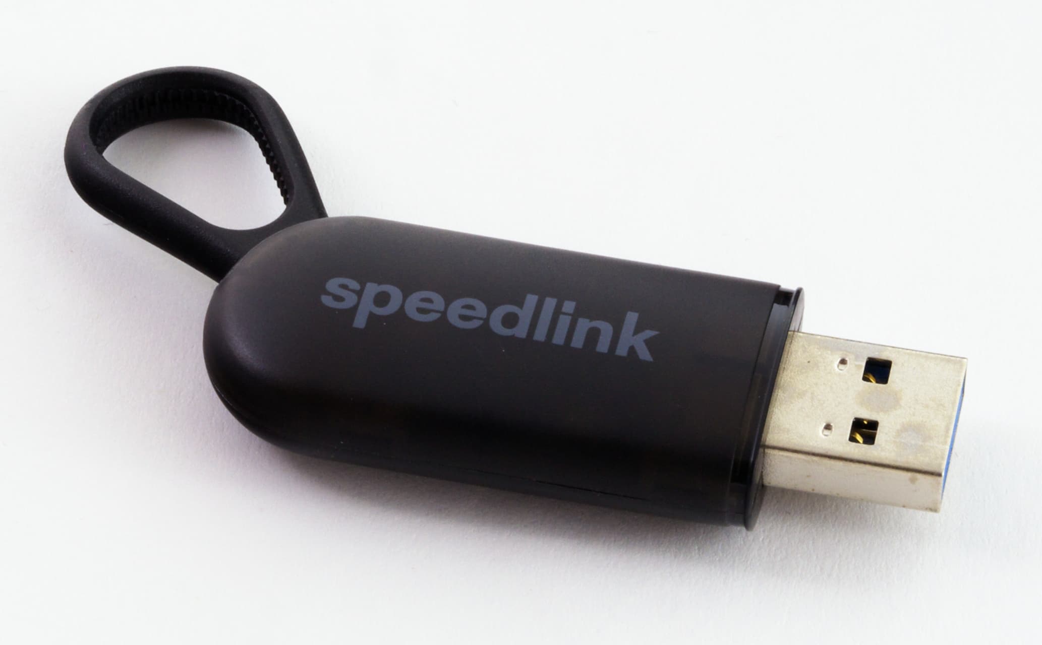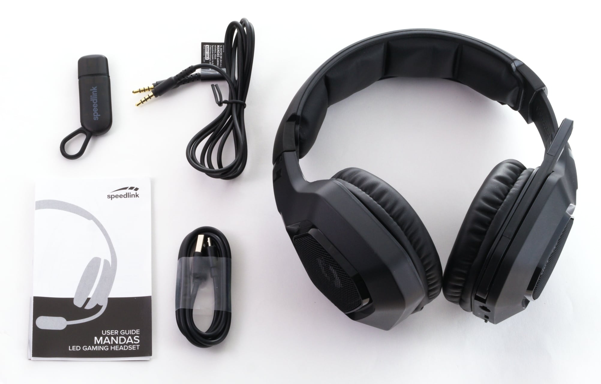 Eine solche liegt auch dem Mandas-Headset bei. Bei diesem gibt es von Speedlink außerdem noch einige weitere Beigaben: Neben dem USB-Dongle für die Drahtlosverbindung liegen noch ein vierpoliges Klinkenkabel mit 1,2 Meter Länge und ein USB-Ladekabel mit 1,0 Meter Länge bei. Damit ist das Mandas direkt einsatzbereit und ab Werk zu den meisten Abspielgeräten kompatibel. Lediglich wer das Headset per Kabel an einem Desktop-PC betreiben will, der braucht mitunter noch einen Y-Splitter.
