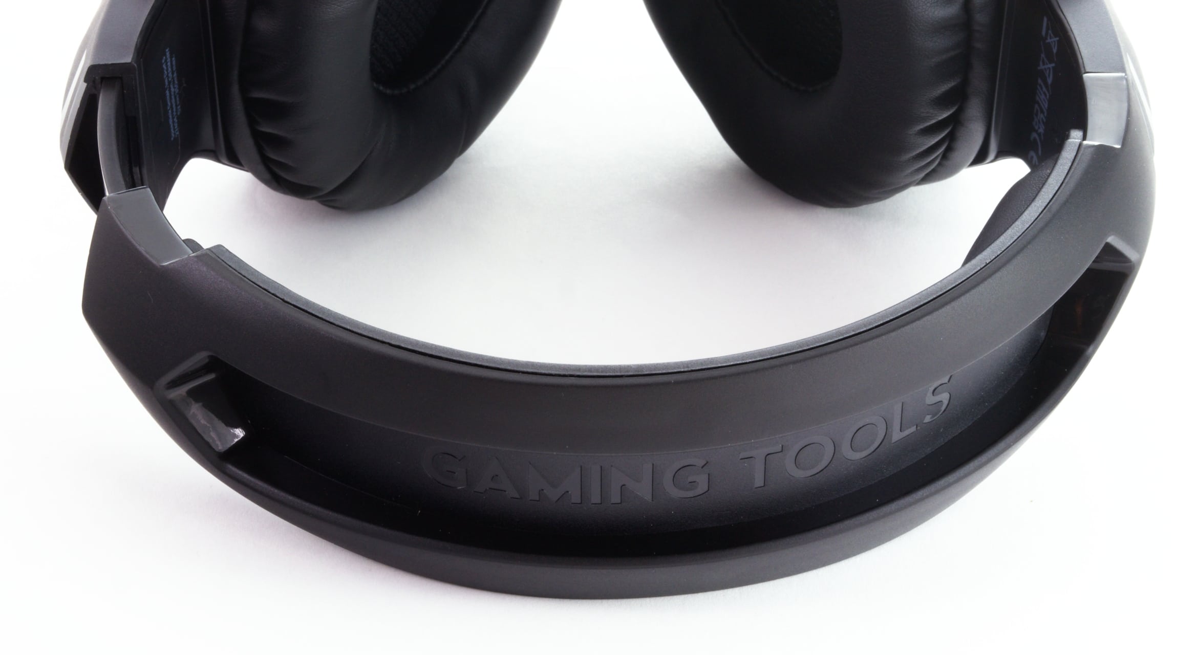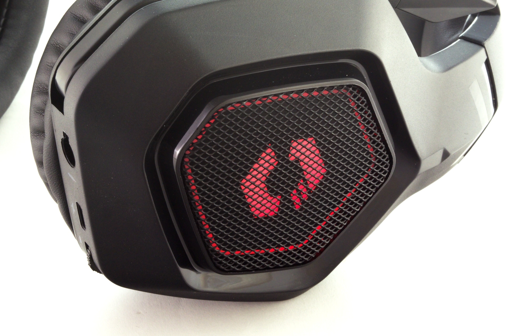 Als Material für das Headset setzt Speedlink fast durchgehend schwarzen Kunststoff ein, Metall ist lediglich an der Längenverstellung und den seitlichen Metallgittern zu sehen. Unter diesen befindet sich wiederum je ein Speedlink-Logo, das im Betrieb von roten LEDs beleuchtet wird. Diese sind allerdings nur im kabellosen Betrieb aktiv – bei der Wiedergabe über einen Klinkenstecker bleibt das Headset unbeleuchtet.