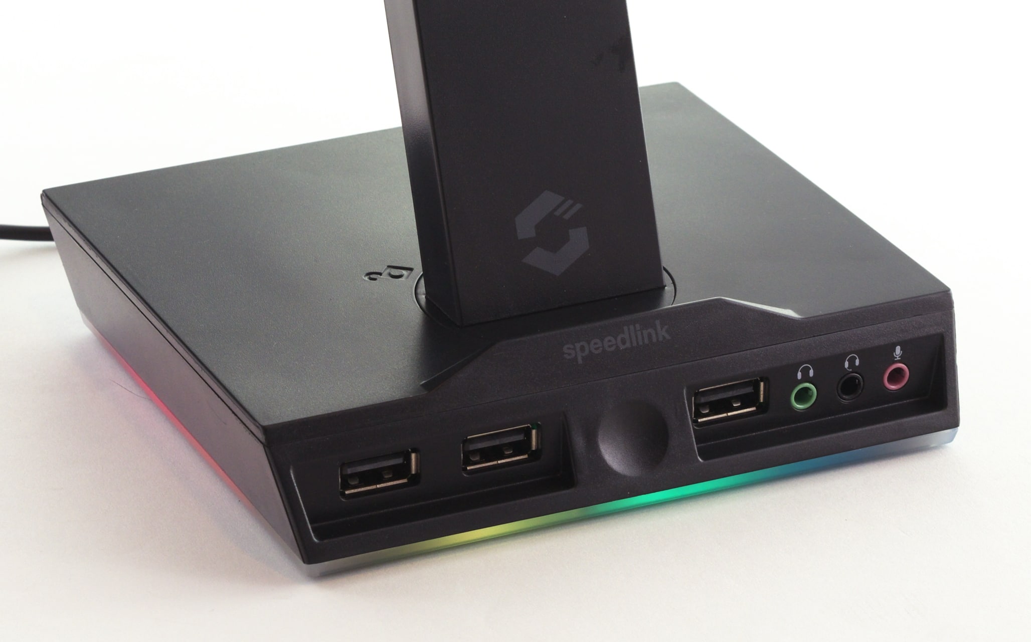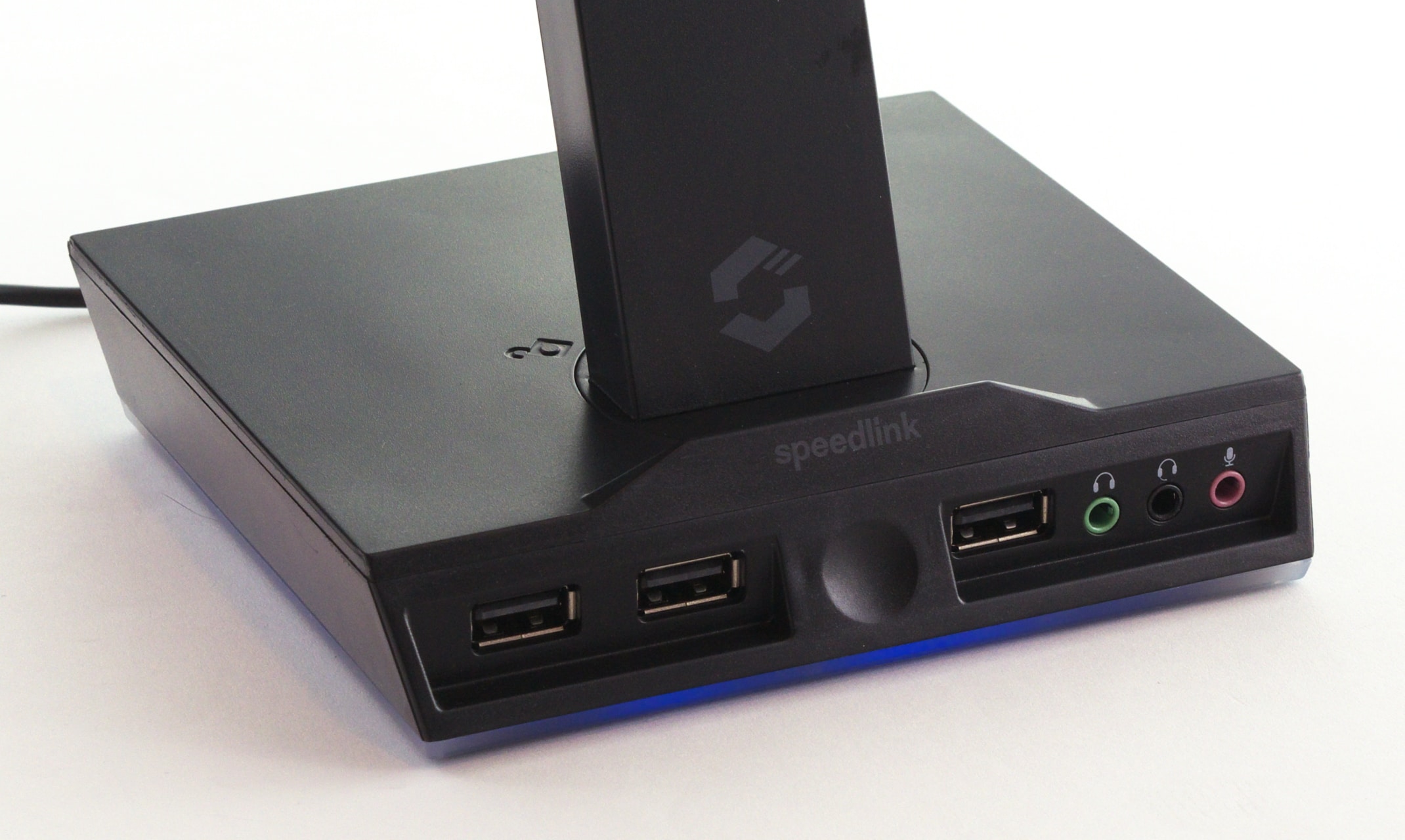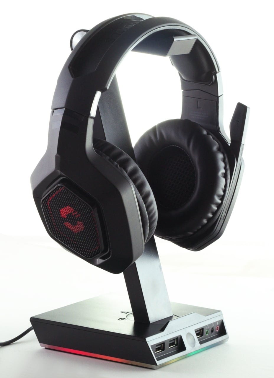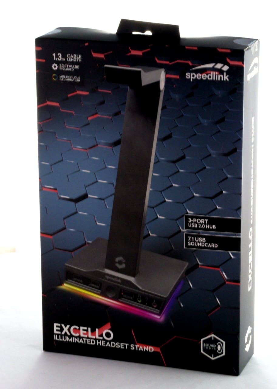Parallel dazu schauen wir uns außerdem noch ein weiteres, passendes Produkt von Speedlink an. Unter dem Namen „Excello“ verkauft das Unternehmen für € 27,04 * [Testzeitpunkt: 25 Euro] eine Headset-Halterung, die eine RGB-Beleuchtung, ein USB-Hub und eine integrierte Soundkarte mit sich bringt.
