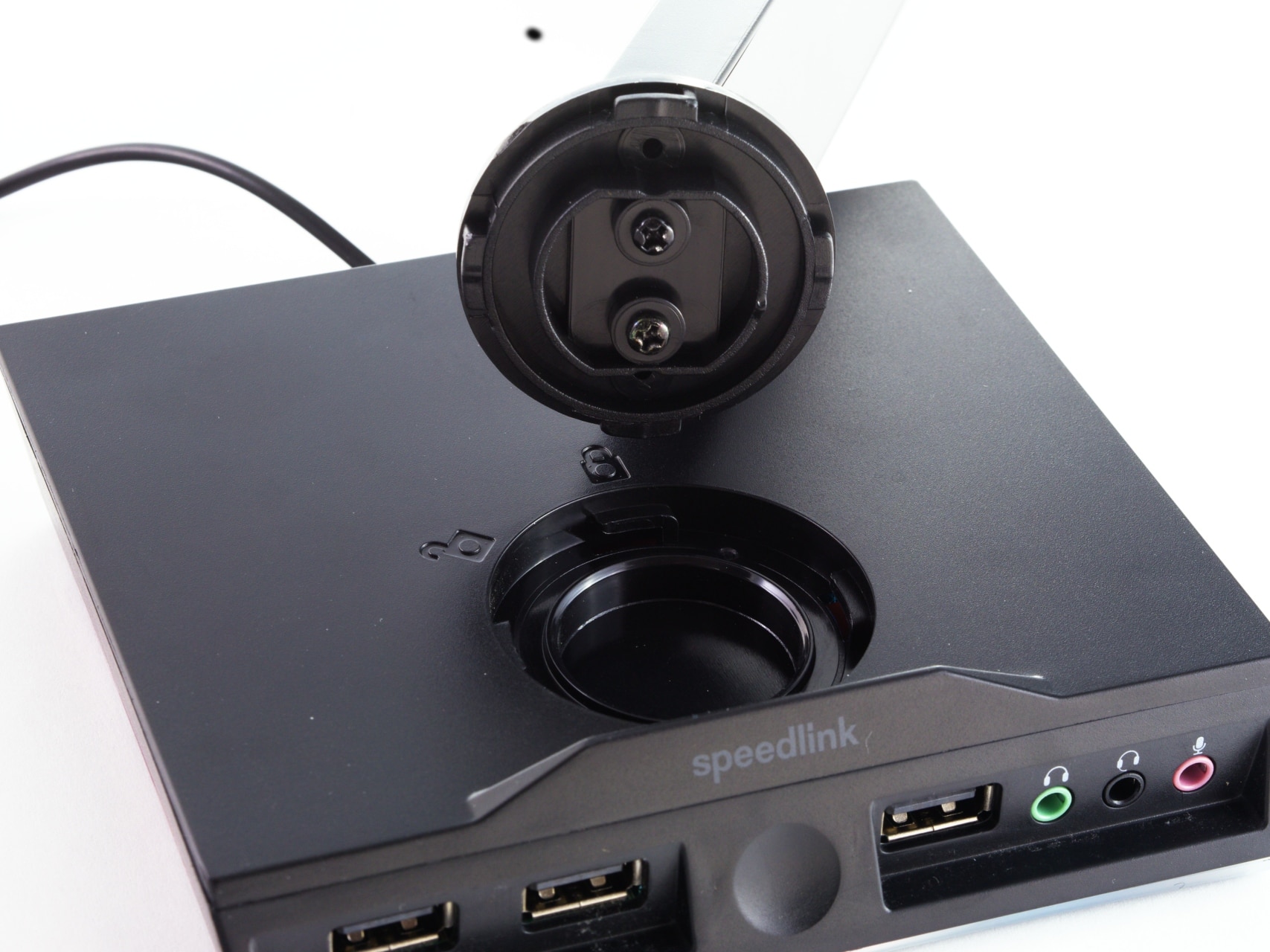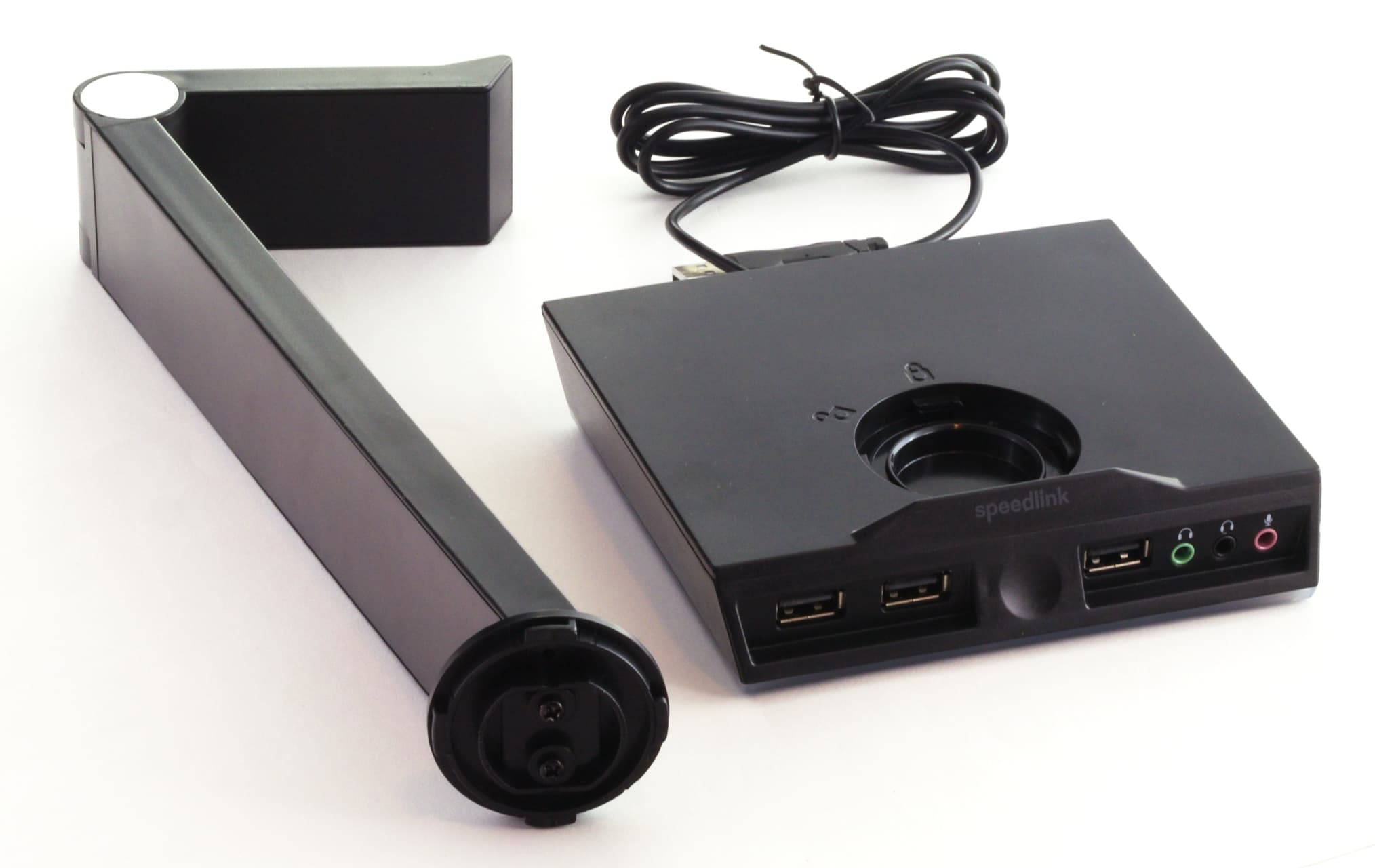 Der Aufbau des Excello ist denkbar einfach: Der Haltearm wird einfach in die Basis gesteckt und nach rechts gedreht – dann sitzt er fest und stabil. Die weitere Verwendung ist dann ebenso simpel: Das Headset kann einfach auf dem Arm abgelegt oder weggenommen werden, und das USB-Hub, der verbaute Touch-Sensor sowie die verbauten Audioanschlüsse funktionieren einwandfrei. Hierbei ist zu erwähnen, dass Speedlink die Tonsignale nicht einfach von einem angeschlossenen Computer durchschleift, sondern im Excello eine kleine Soundkarte verbaut hat – dazu im nächsten Abschnitt mehr.