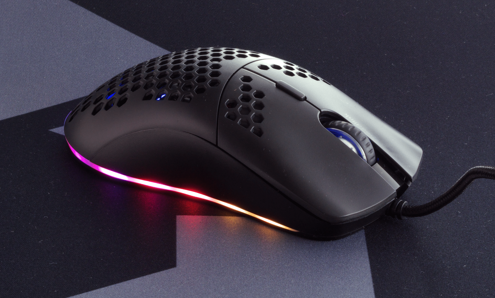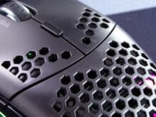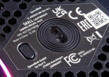 Mit Hinblick auf die Optik sorgt das Hexagonmuster in unseren Augen für ein spannendes Design, gerade die von innen sichtbare Beleuchtung macht die Skell spannend. Zudem ist auch die Verarbeitungsqualität der Maus weitgehend gelungen: Das Gehäuse ist trotz der Durchbrüche sehr verwindungssteif, und der verwendete Kunststoff angenehm. Bei unserem Modell hat die linke Maustaste aber ein winziges Spiel nach oben. Das stört die Funktion der Maus glücklicherweise nicht im geringsten, es kann aber bei schwitzigen Händen dafür sorgen, dass es das anheben der Finger durch das Nachschwingen der Tastenabdeckung ein leises Geräusch macht. Zudem sind die Übergänge zwischen den Gehäuseschalen bei genauem Hinsehen nicht perfekt sauber. Angesichts des Preises der Skell ist das aber wirklich meckern auf hohem Niveau, und wenn es einem nicht gerade explizit auffällt, dann dürfte das zuvor erwähnte Geräusch niemanden stören.