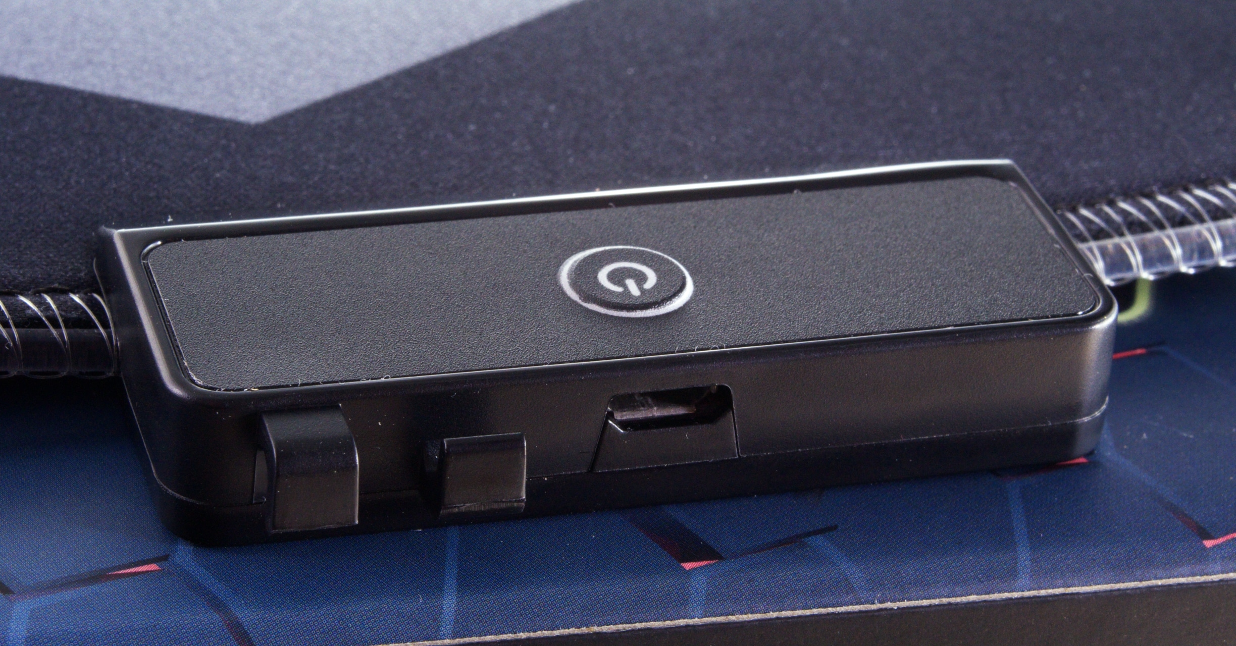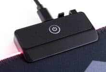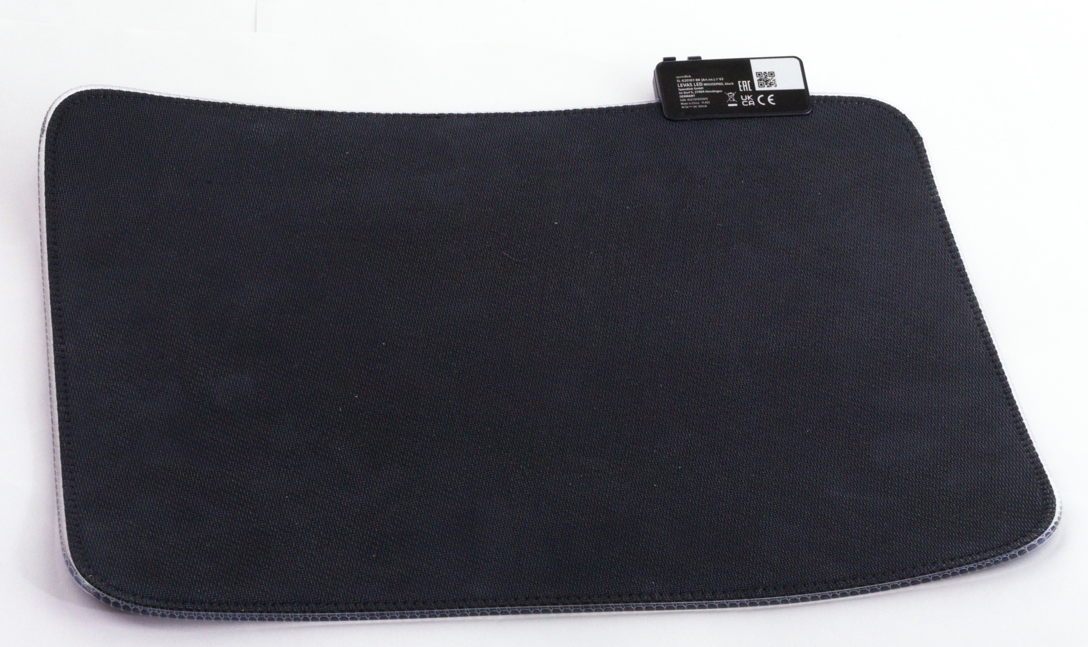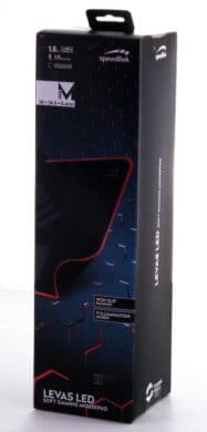 Das Speedlink Levas LED setzt auf einen typischen Stoffmauspad-Aufbau mit einem RGB-Controller an der oberen linken Seite sowie einer umlaufender Beleuchtung. Der Controller beherbergt dabei die Elektronik, den Micro-USB-Anschluss und die Taste, mit der die RGB-Beleuchtung gesteuert werden kann. Außerdem ist an dem Controller eine kleine Kabelführung untergebracht, durch die man das mitgelieferte USB-Kabel – falls gewünscht – nach rechts führen kann.