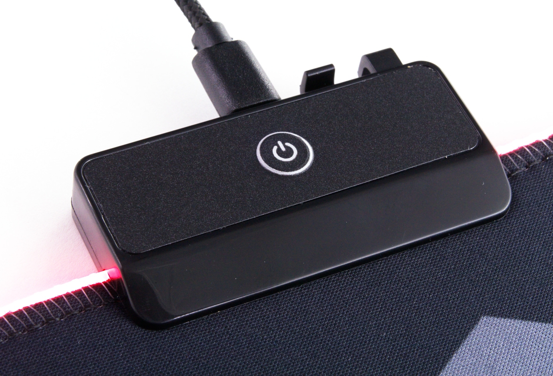 Das Mauspad selbst besteht aus einer angenehmen und dicht gewebten Stoffoberfläche, die von einem Lichtleiter umgeben ist. Dieser wird durch mehrere transparente Fäden stabil am Stoffsaum gehalten. Die Beleuchtung wird dabei durch LEDs im Controller übernommen, deren Licht über den Lichtleiter um den Rand herumgeleitet wird. Die daraus resultierende Helligkeitsverteilung ist zwar nicht ganz gleichmäßig, doch optisch trotzdem ansprechend. Wer ein beleuchtetes Mauspad haben will, der kommt hier durchaus auf seine Kosten. Als Farbeffekte stehen dabei unter anderem diverse statische Farben sowie Regenbogen- und Atmen-Effekt zur Verfügung.