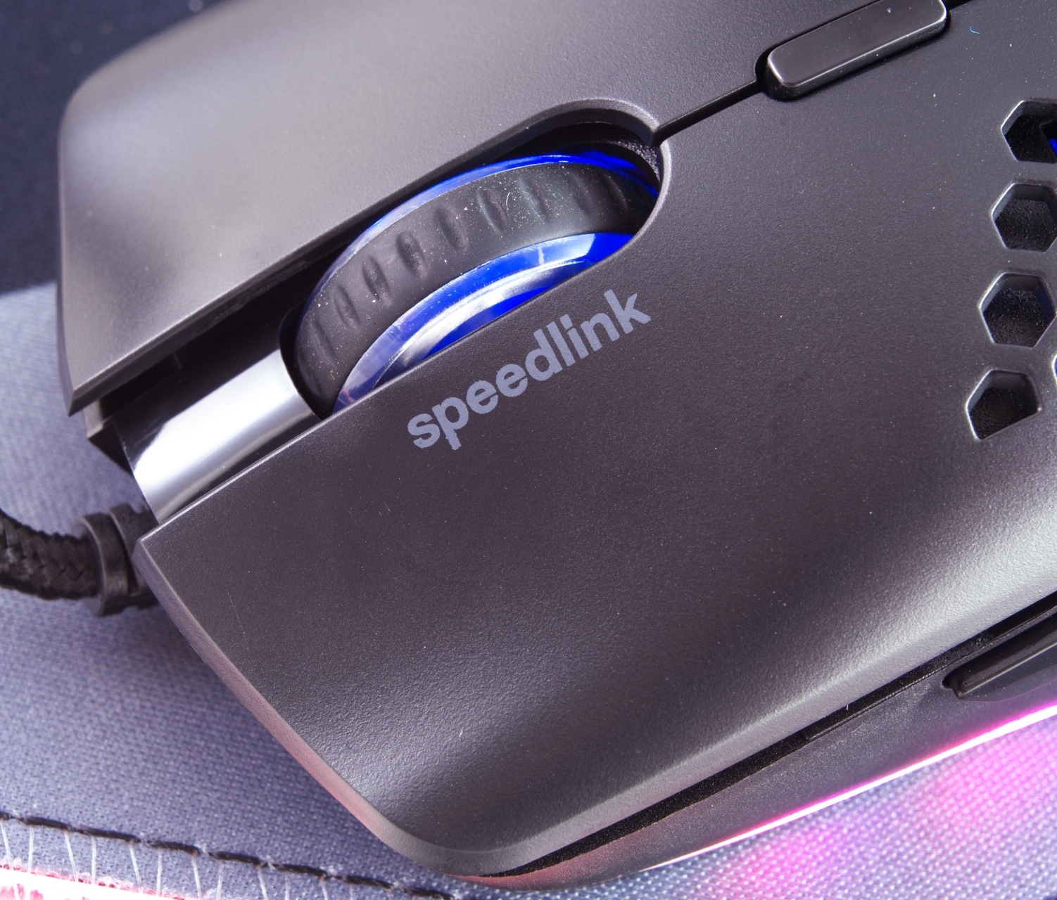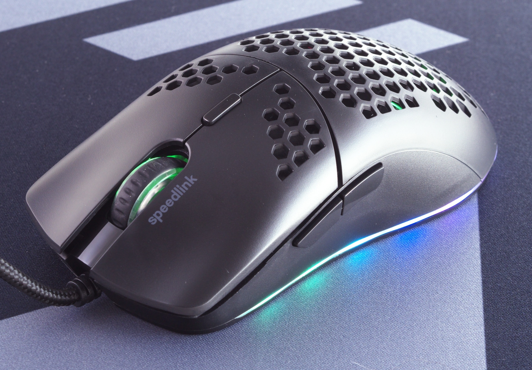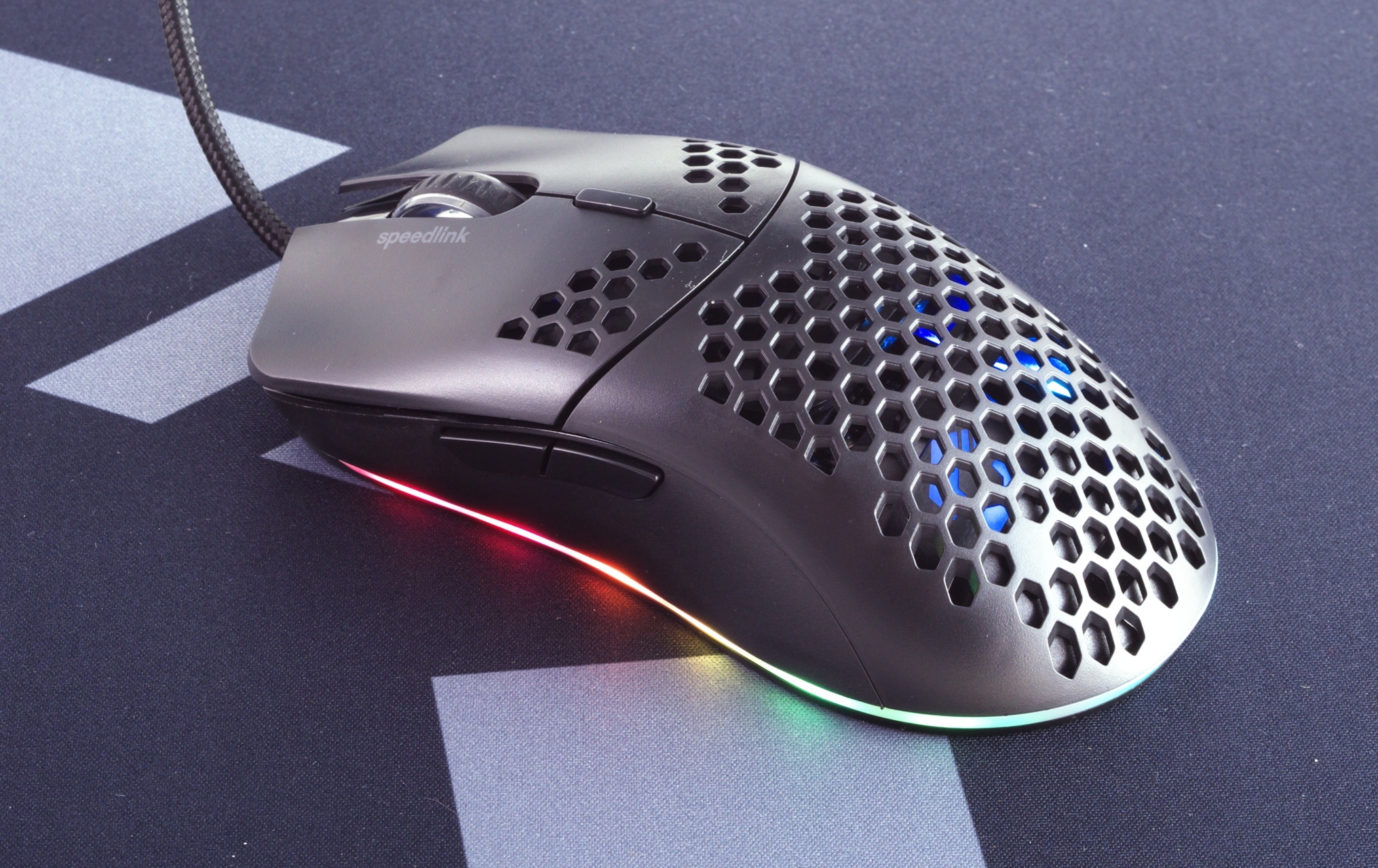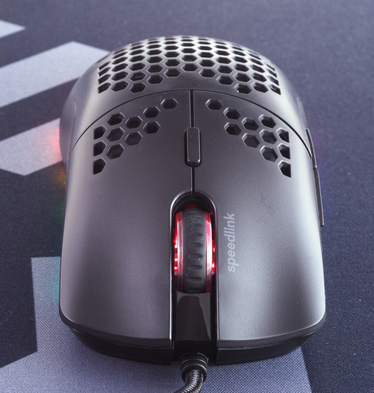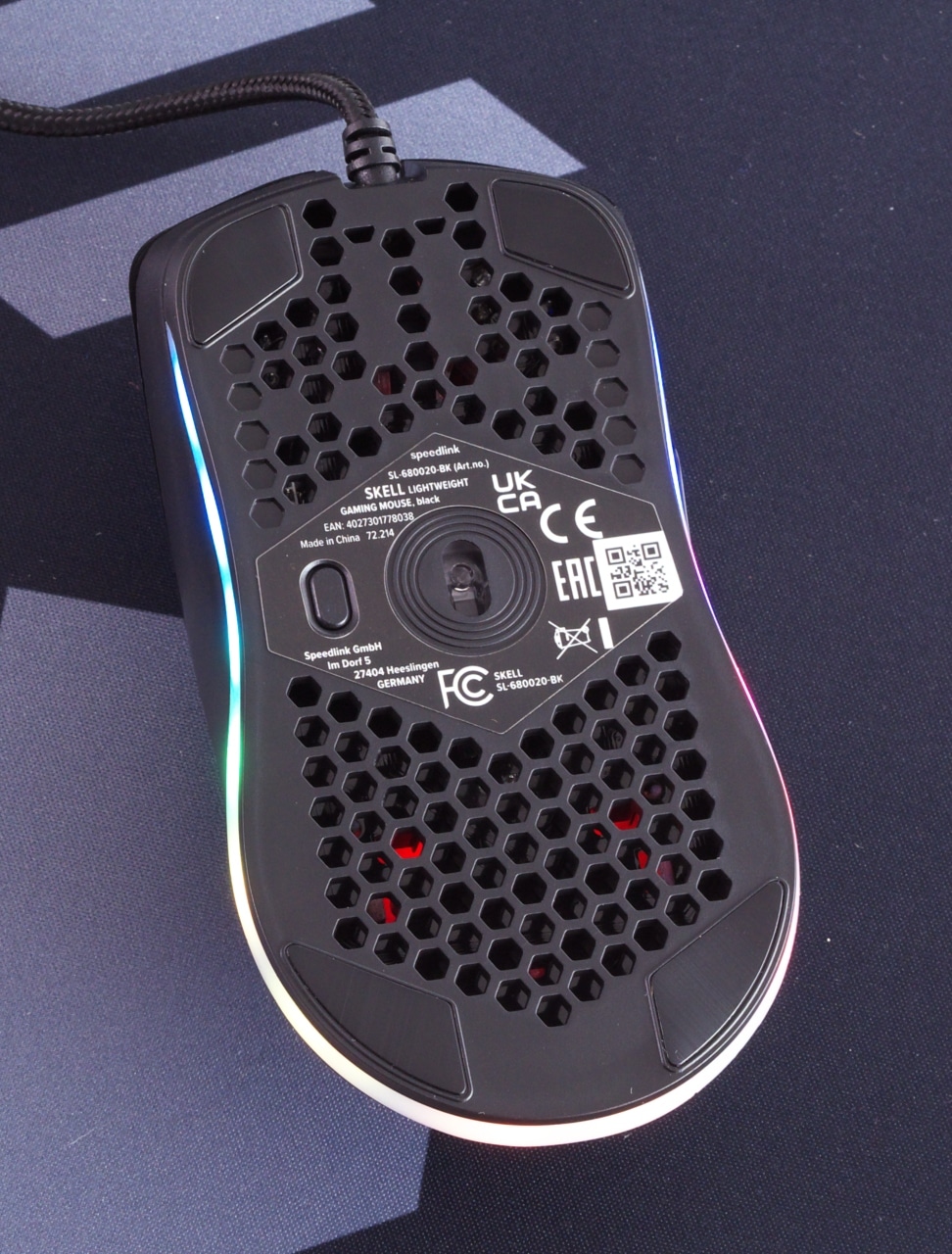 Als Gehäusematerial setzt Speedlink bei der Skell durchgehend auf mattschwarzen Kunststoff, der am gesamten Mausrücken und an der Unterseite von hexagonalen Durchbrüchen durchzogen ist. Die Ausschnitte dienen dabei der Gewichtsreduktion, sie erlauben zugleich aber auch einen Blick auf das Innenleben der Maus. Unter anderem lässt sich so das schwarze PCB erahnen. Außerdem nutzt Speedlink die Ausschnitte auch für ein optisches Extra: Neben des beleuchteten, transparenten Kunststoffstreifens am unteren Rand der Maus verfügt die Skell noch über ein beleuchtetes Logo unter dem Mausrücken, das durch das Hexagonmuster sichtbar ist.