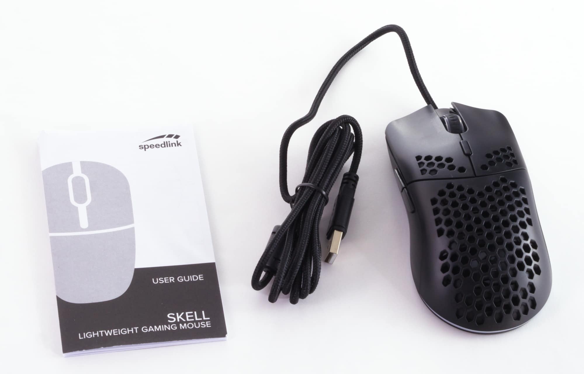 Speedlink setzt sowohl bei der Skell als auch beim Levas LED auf farbig bedruckte Kartons, in denen sich das jeweilige Produkt und das Zubehör befinden. Dieses ist dabei, wie im Preisbereich nicht anders zu erwarten, überschaubar. Bei der Skell liegt lediglich eine Anleitung dabei. Das 1,5 Meter lange, gesleevte Anschlusskabel ist fest an der Maus angebracht.