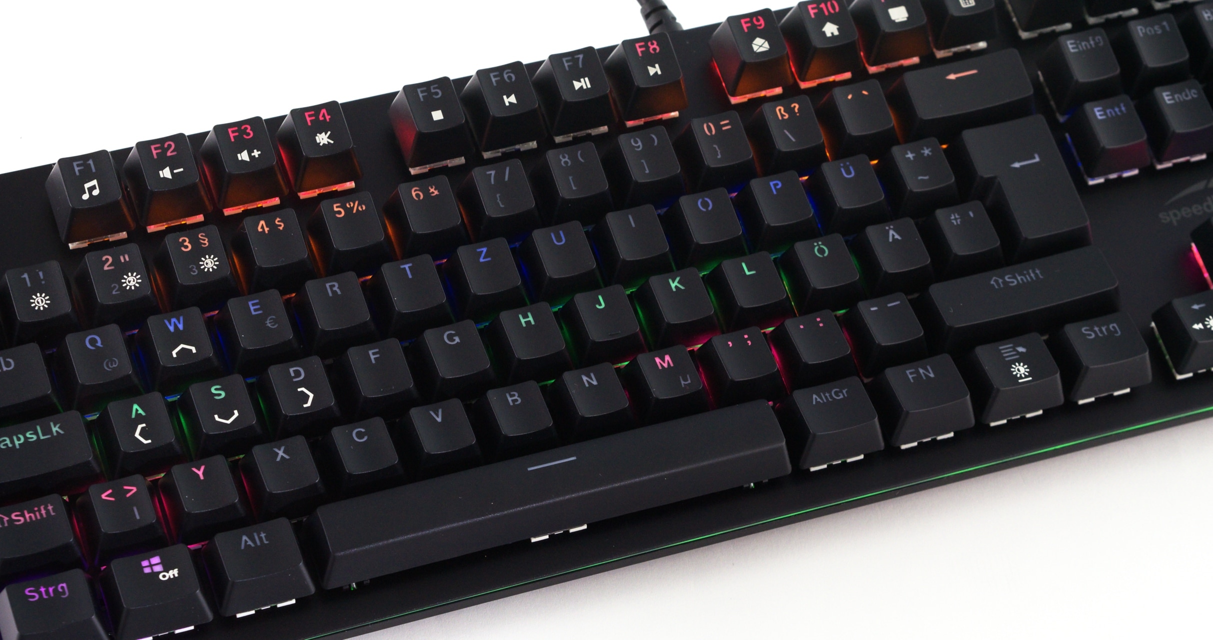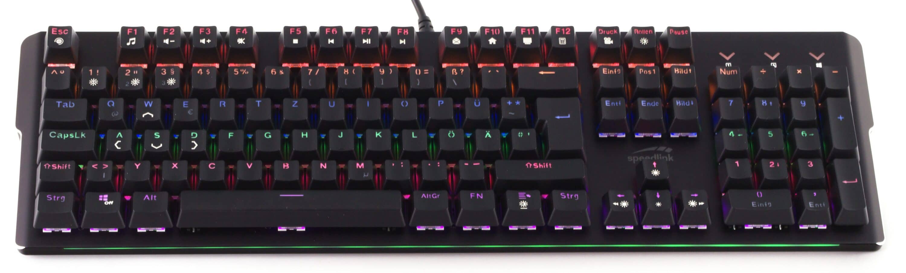 Dasselbe gilt für die Entscheidung von Speedlink, alle durch die FN-Taste realisierten Zusatzfunktionen nicht zu beleuchten, sondern mit weißer Farbe aufzudrucken. Dadurch halten sich diese Beschriftungen natürlich nicht an die Farbe der jeweiligen LEDs. Dafür wird so aber das Problem der inhomogenen Beleuchtung umgangen.