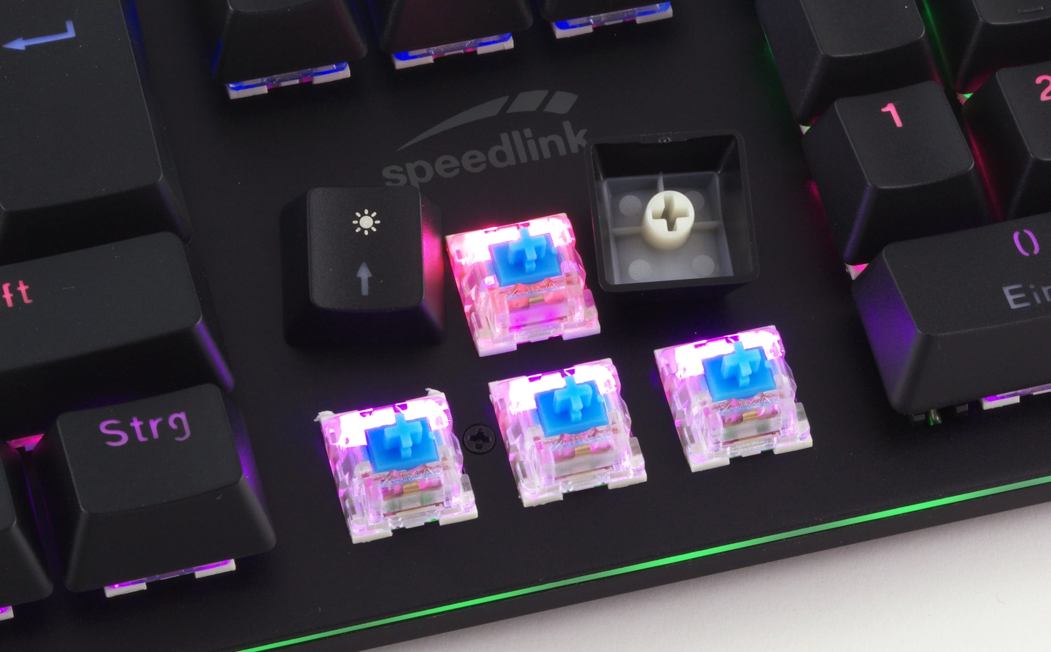 Von Speedlink werden die in der Vela verbauten Taster zwar nicht offiziell angegeben, doch zumindest bei unserem Modell sind Blue-Switches von Jixian verbaut. Diese scheinen sich an den handelsüblichen Cherry MX Blue zu orientieren: Das Tippgefühl ist grob vergleichbar, und auch das akustische Feedback beim Auslösen der Tasten ist verhältnismäßig hell. Ob die Switches im direkten Vergleich mit dem Original mithalten können sei dahingestellt, doch in jedem Fall ist das Tippgefühl dem aller handelsüblichen Rubberdome-Tastaturen bei weitem überlegen. Dem Anspruch eines Einstiegsgeräts in die Welt der mechanischen Tastaturen wird die Vela somit gerecht: Es tippt sich angenehm auf ihr, und das vorhandene Federpingen dürfte die allermeisten Nutzer – und insbesondere Einsteiger – nicht stören.