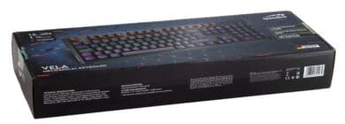 Die Vela wird in einem farbig bedrucktem Karton und ohne nennenswertes Zubehör geliefert. Das 1,5 m lange und ungesleevte Kabel ist fest an der Tastatur installiert. Neben dem Gerät selbst befindet sich in der Verpackung daher lediglich noch eine kurze Anleitung, in der unter anderem die Beleuchtungseffekte erklärt werden.