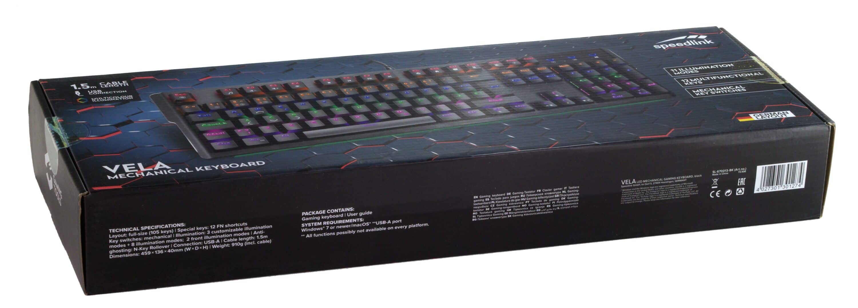 Diesen Sommer hat Speedlink eine neue Tastatur namens Vela vorgestellt, die einen günstigen Einstieg in die Welt der mechanischen Switches bieten soll. Das Gerät wird derzeit zu einem Preis von € 29,99 * [Testzeitpunkt: 46 €] verkauft und verspricht dafür ein 100%-Layout mit Blue-Switches sowie einer mehrfarbigen LED-Beleuchtung.