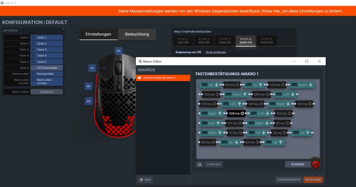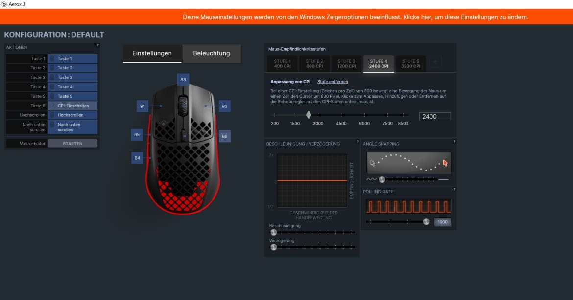 Sämtliche Tasten lassen sich auf Wunsch neu zuweisen und anpassen, die fünf vorangestellten CPI-Stufen können individuell angepasst werden, Beschleunigung und Verzögerung können getrennt voneinander justiert werden. Außerdem lässt sich die Polling-Rate auf Wunsch herunterregeln, während dank Angle Snapping die Erfassung des Mauszeigers individualisiert werden kann.