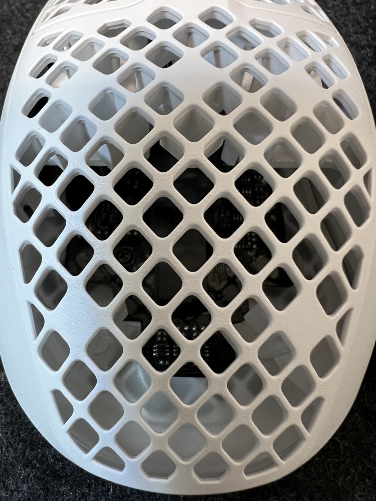 Die Löcher nehmen den gesamten Mausrücken ein und erstrecken sich in einem Drittel über die beiden mechanischen Hauptschalter. Dabei richtet sich die ergonomische Form der Maus sowohl an Rechts- als auch an Linkshänder, während aufgrund der Formgebung alle gängigen Griffstile (also Finger Grip, Claw Grip und Palm Grip) gleichermaßen unterstützt werden.