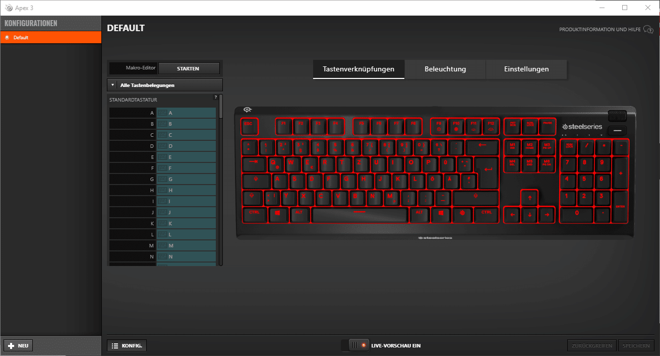 In der Software sind diverse Funktionen zu finden. So kann man natürlich die Tasten neu belegen und mit Makros versorgen sowie die RGB-Beleuchtung der Tastatur steuern. Aber das sind die Basics.