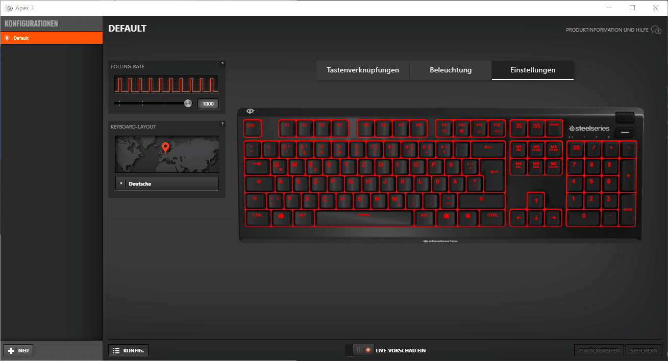 Per Druck auf die SteelSeries-Taste in Kombination mit den Tasten F9 bis F12 können unter anderem die Profile gewechselt werden. Doch auch Makros können so unkompliziert ohne Software aufgenommen werden.