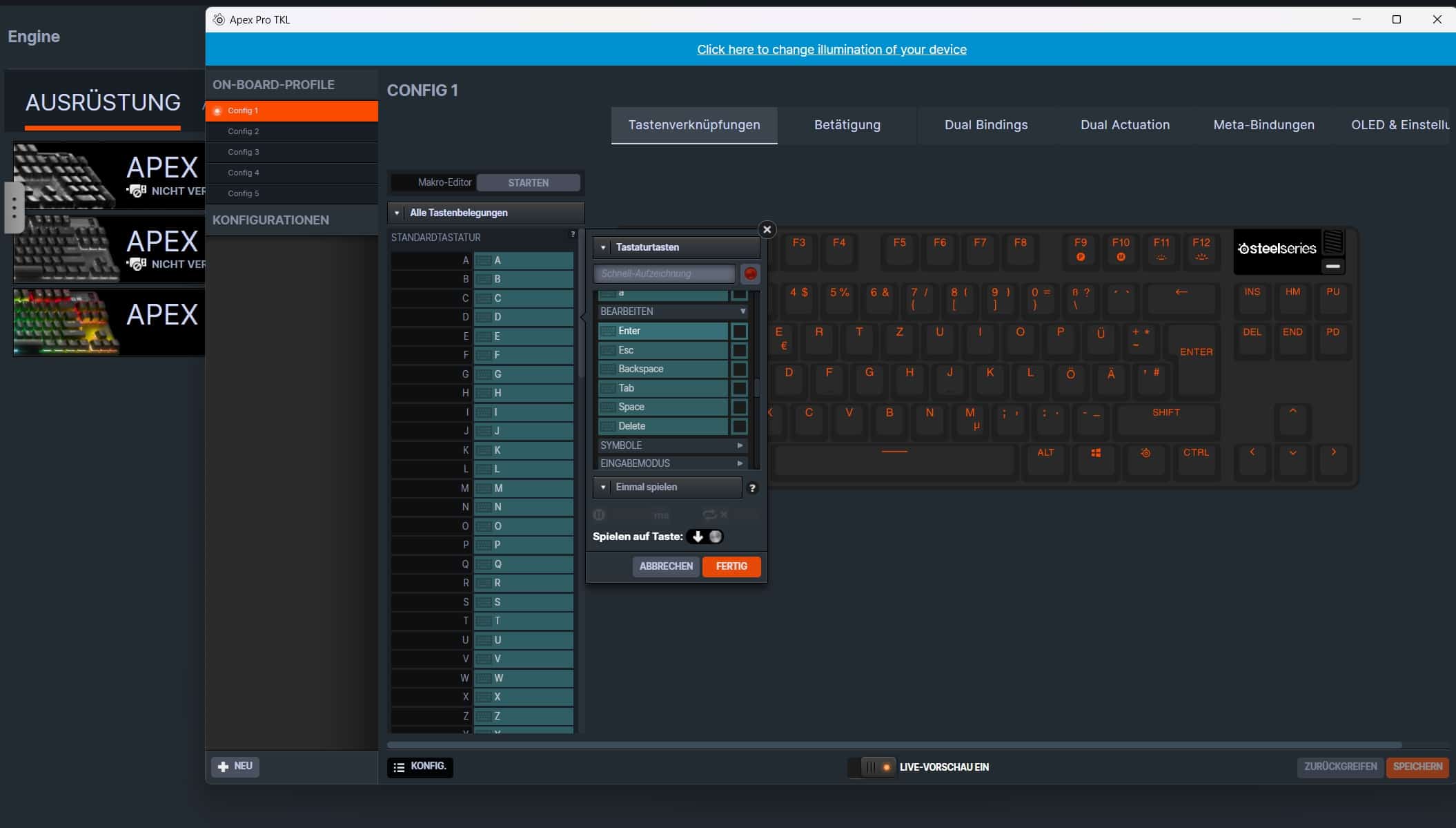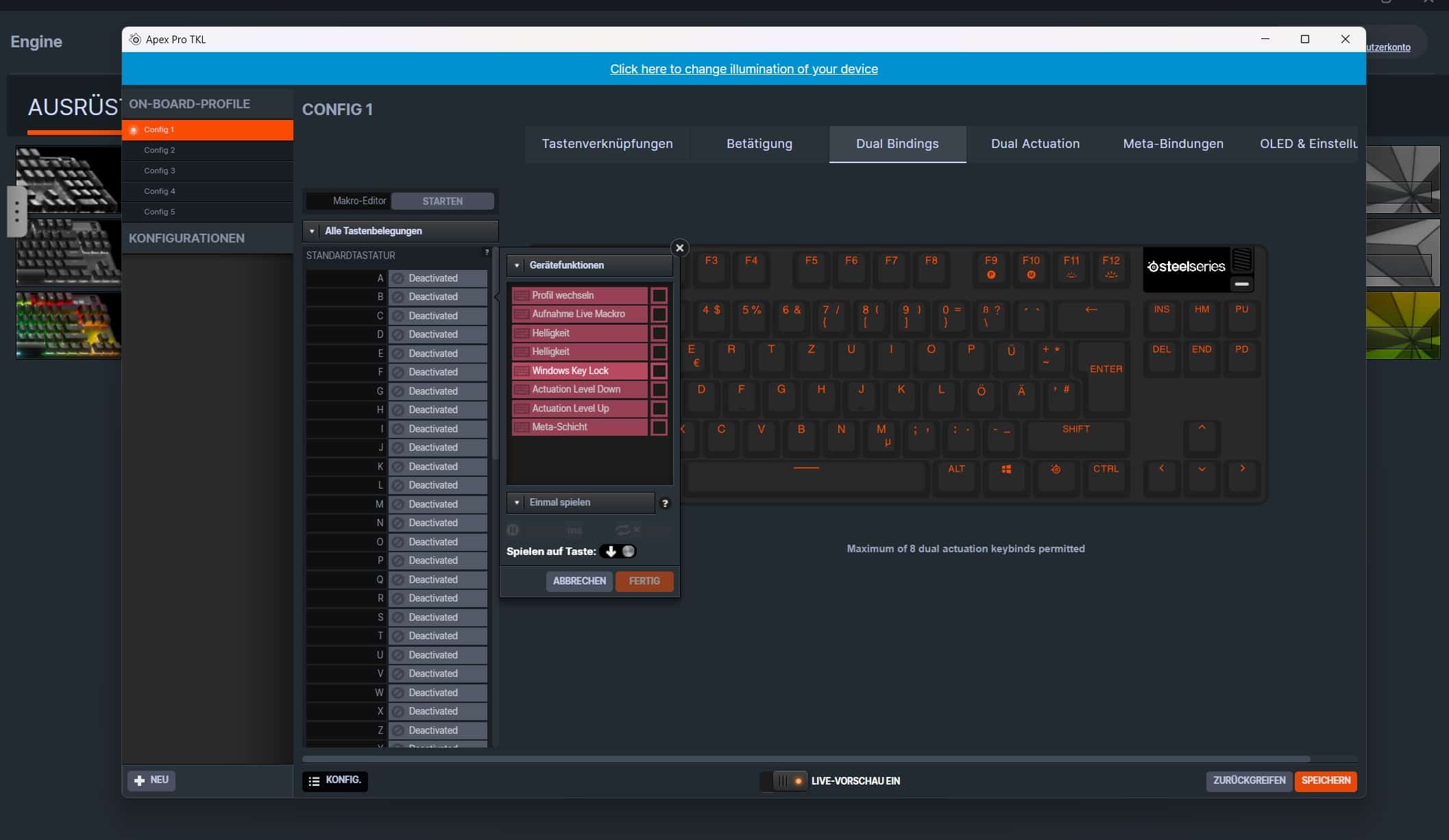 Auf Wunsch lassen sich sogar zweite Tastenbelegungen (Dual Bindings) und die bereits angesprochenen Dual Actuations und Meta-Bindungen als Kommandos in Verbindung mit der FN-Taste anlegen.