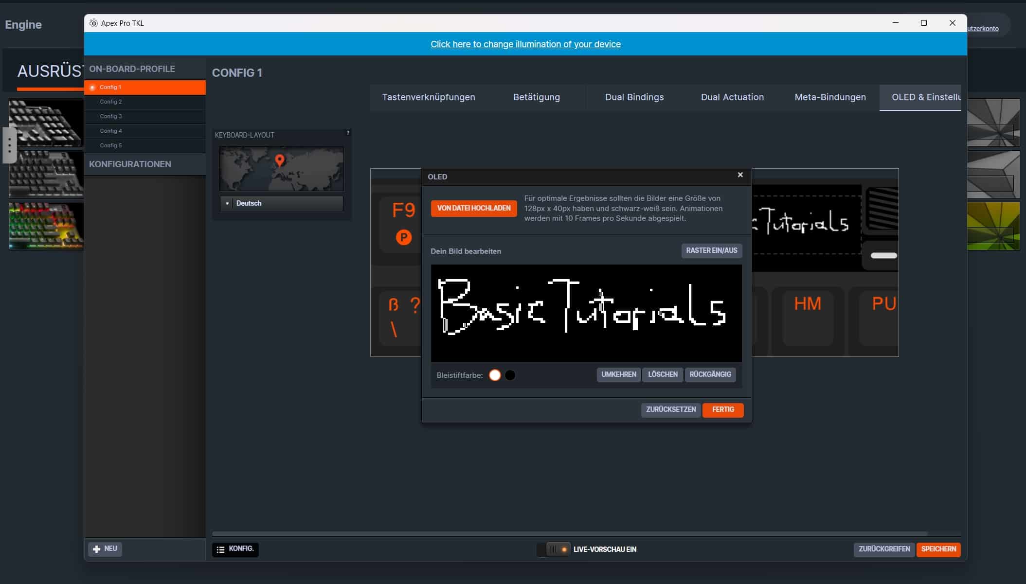 Zudem kannst du das dargestellte Logo auf dem OLED-Bildschirm anpassen. Hierzu kannst du eigene, kleine Logos hochladen oder selbst mit der Maus etwas kritzeln. Sogar Animationen können mit maximal 10 Bildern pro Sekunde dargestellt werden.