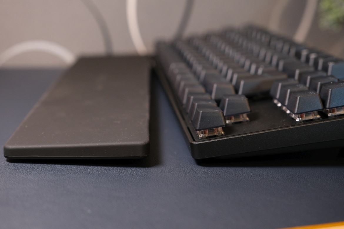 Zudem punkten die Tasten dank der griffigen Oberfläche und den gelungenen PBT-Tastenkappen mit einer angenehmen Haptik. Als sehr praktisch erweist sich zudem die Handballenauflage, die ganz einfach magnetisch an die Tastatur andockt und für eine gute Entlastung sorgt. In Kombination mit den ausklappbaren Standfüßen, die ganz ohne oder in zwei verschiedenhohen Winkeln aufgestellt werden können, sorgt das für eine angenehme Ergonomie.