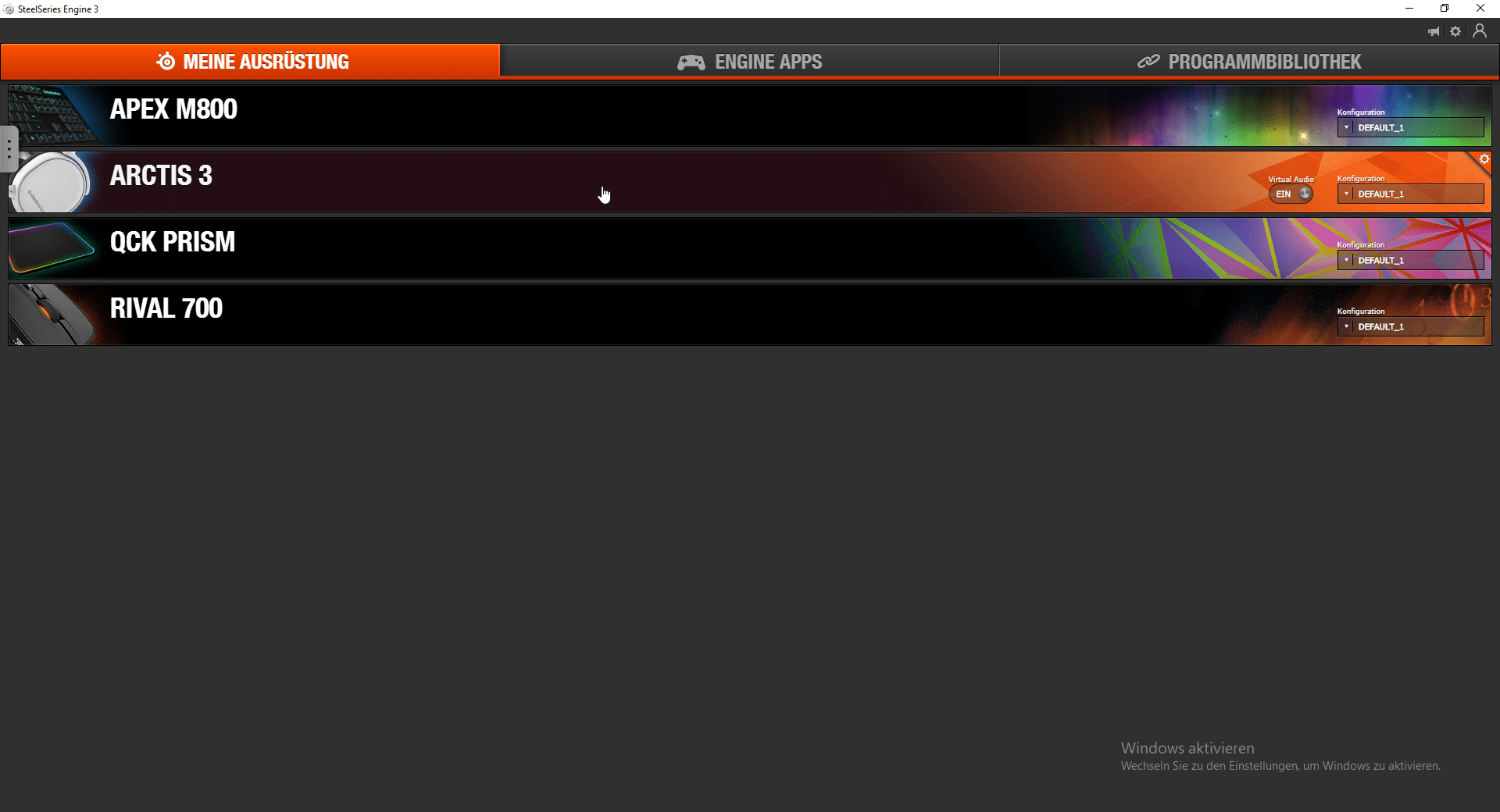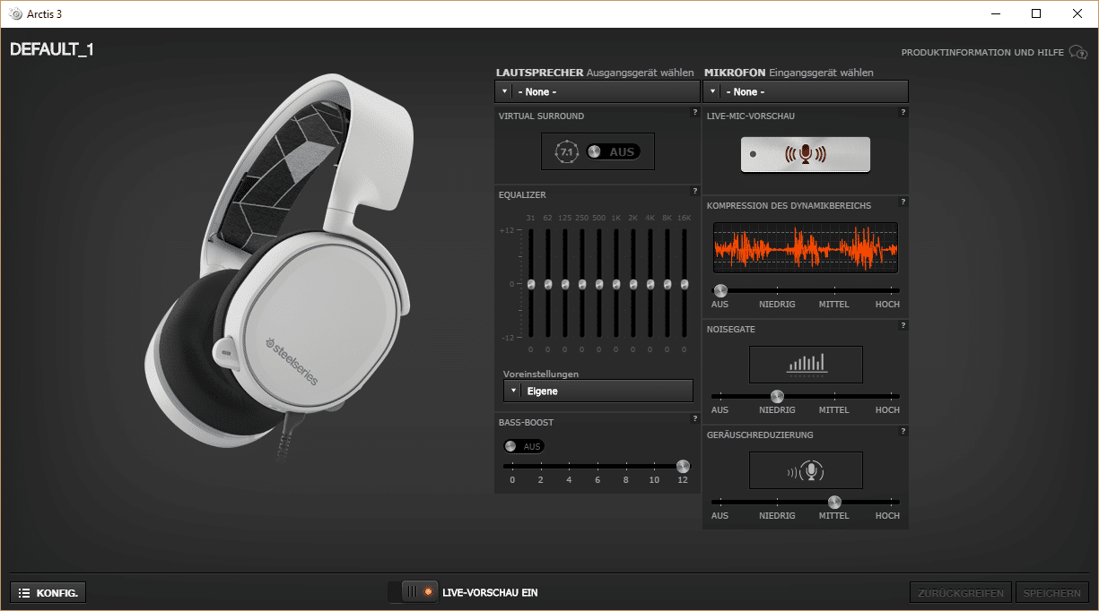 In der Software wählt ihr zuerst aus, über welchen Anschluss ihr das Arctis 3 angeschlossen habt. In den Einstellungen könnt ihr verschiedene Profile anlegen, es ist somit möglich je nach Spiel eigene Einstellungen zu wählen. Ihr könnt mit dem Equalizer den Sound individualisieren, den 7.1 Sound de- oder aktivieren sowie für das Mikrofon das Noise Gate oder die Kompression einstellen.