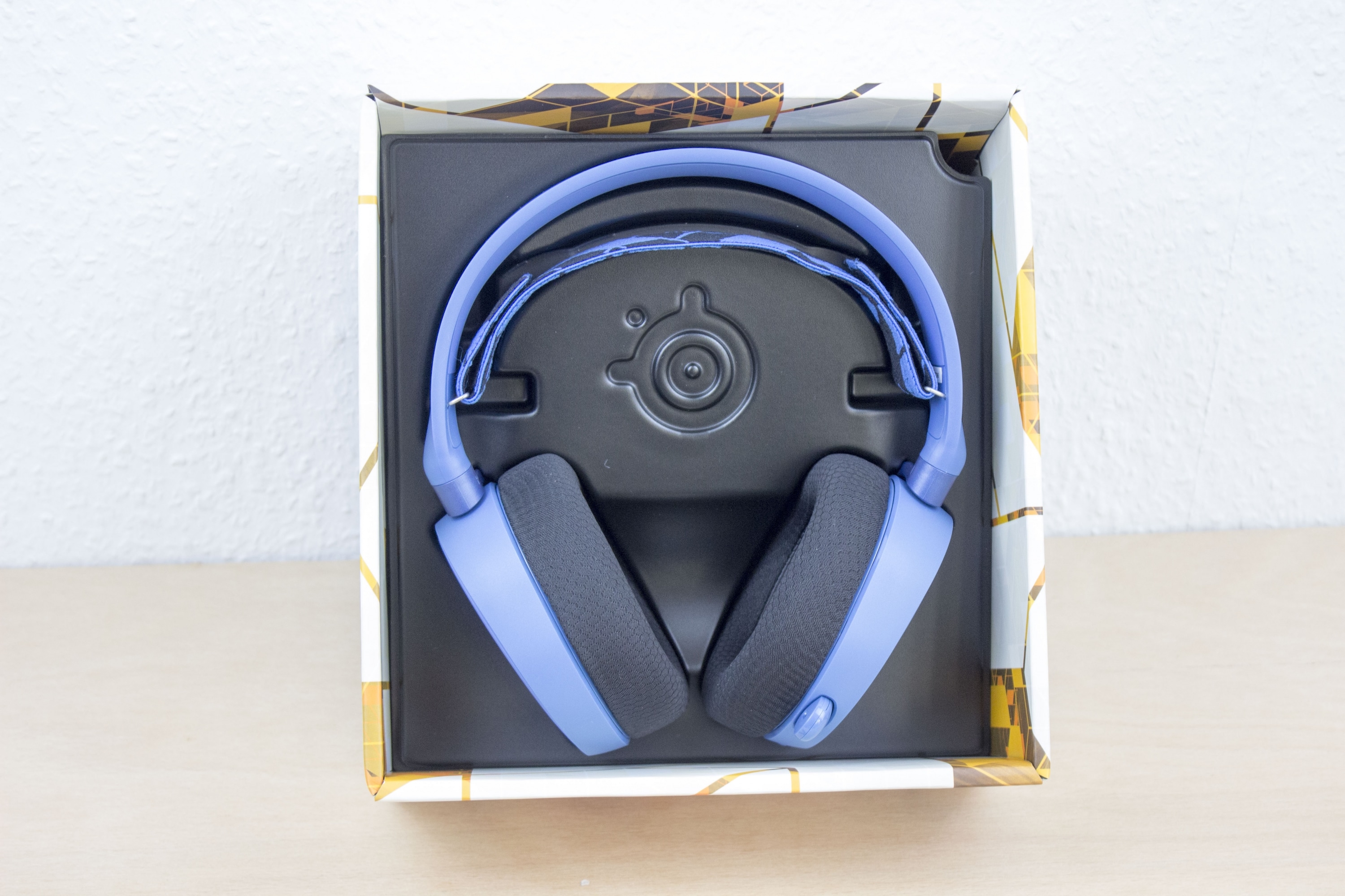 Der erste Eindruck macht schon viel her und vom bisherigen Design der SteelSeries-Headsets ist nicht mehr viel übrig. Das Headset ist sehr schlicht gehalten, weiß aber duch das Design der Ohrmuscheln und das Headband zu überzeugen. Hat jemand das SteelSeries-Headset auf dem Kopf, fällt direkt auf, dass es ein Arctis-Headset ist. Anders als bei anderen Headsets liegt der Bügel nicht direkt auf dem Kopf, sondern nur das Headband. Über dieses Band wird auch die Größe eingestellt. Durch diese Technik entsteht kein Druck auf Kopf, selbst wenn das Headset eng eingestellt ist. Dadurch entsteht auch ein sehr angenehmes Tragegefühl.