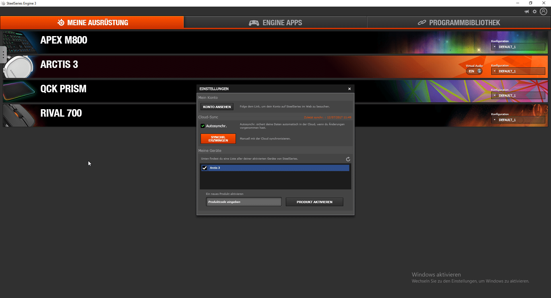 Natürlich lässt sich das Arctis 3 auch in der SteelSeries Engine 3 verwalten und einrichten. Bevor ihr aber in den vollen Genuss der Funktionen und auch dem virtuellen 7.1-Sound kommen könnt, müsst ihr euch registrieren und einen Freischaltcode, der dem Headset beiliegt, eingeben. Nachdem ihr euch in der Software mit euren Zugangsdaten angemeldet habt, erscheint automatisch das Headset in der Liste eurer Ausrüstung. SteelSeries muss diesen Weg gehen, da das Headset nicht über USB angeschlossen wird. Wichtig: Solltet ihr das Headset verkaufen wollen, könnt ihr den Code einfach mit weitergeben!