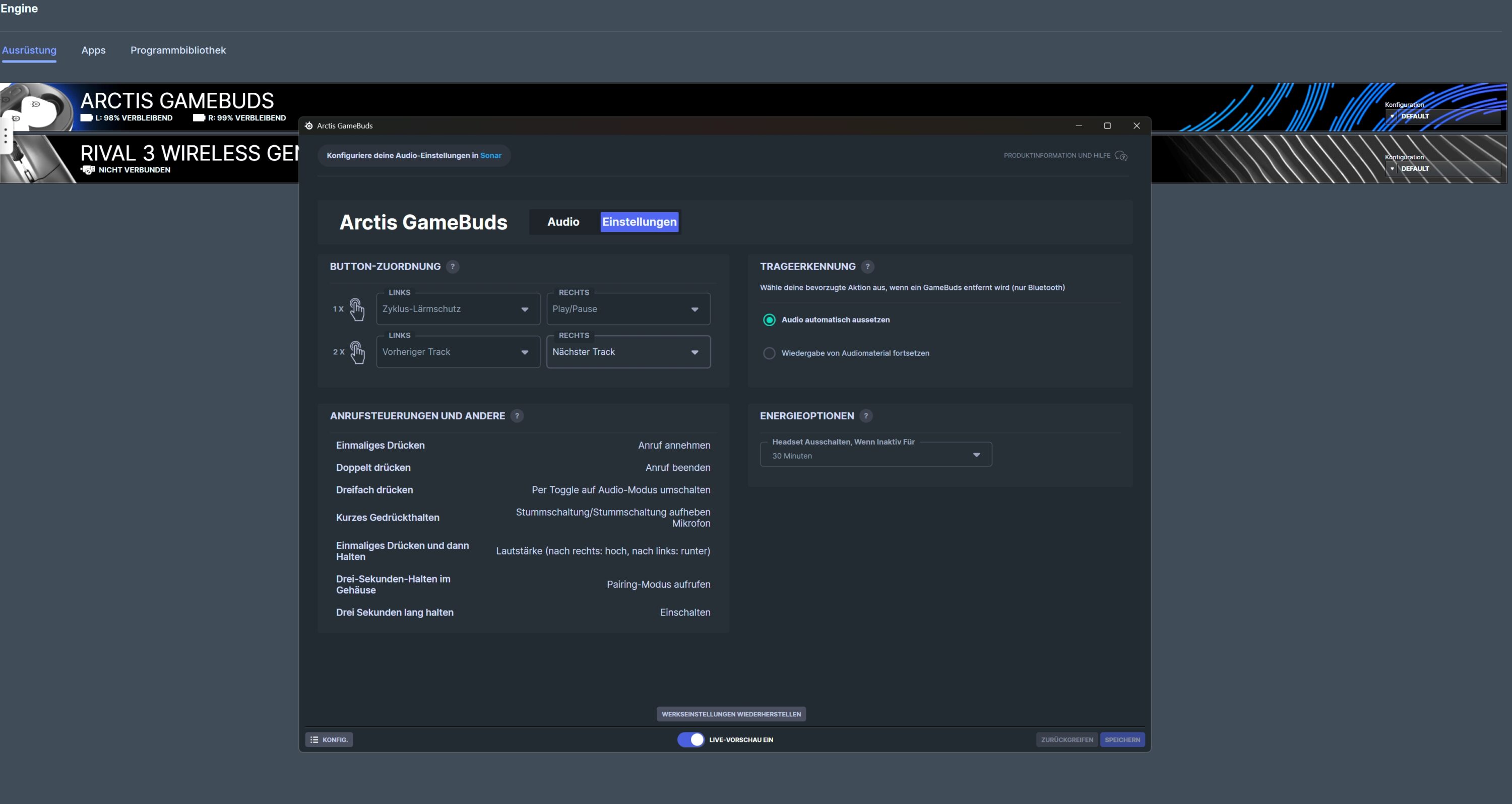 Stichwort App: Hier bietet der Hersteller für die SteelSeries Arctis GameBuds wirklich das volle Programm an. Einerseits steht dir eine Mobile-App namens „Arctis“ zur Verfügung. Diese informiert nicht nur über den Akkustand, sondern bietet auch viele praktische Features.