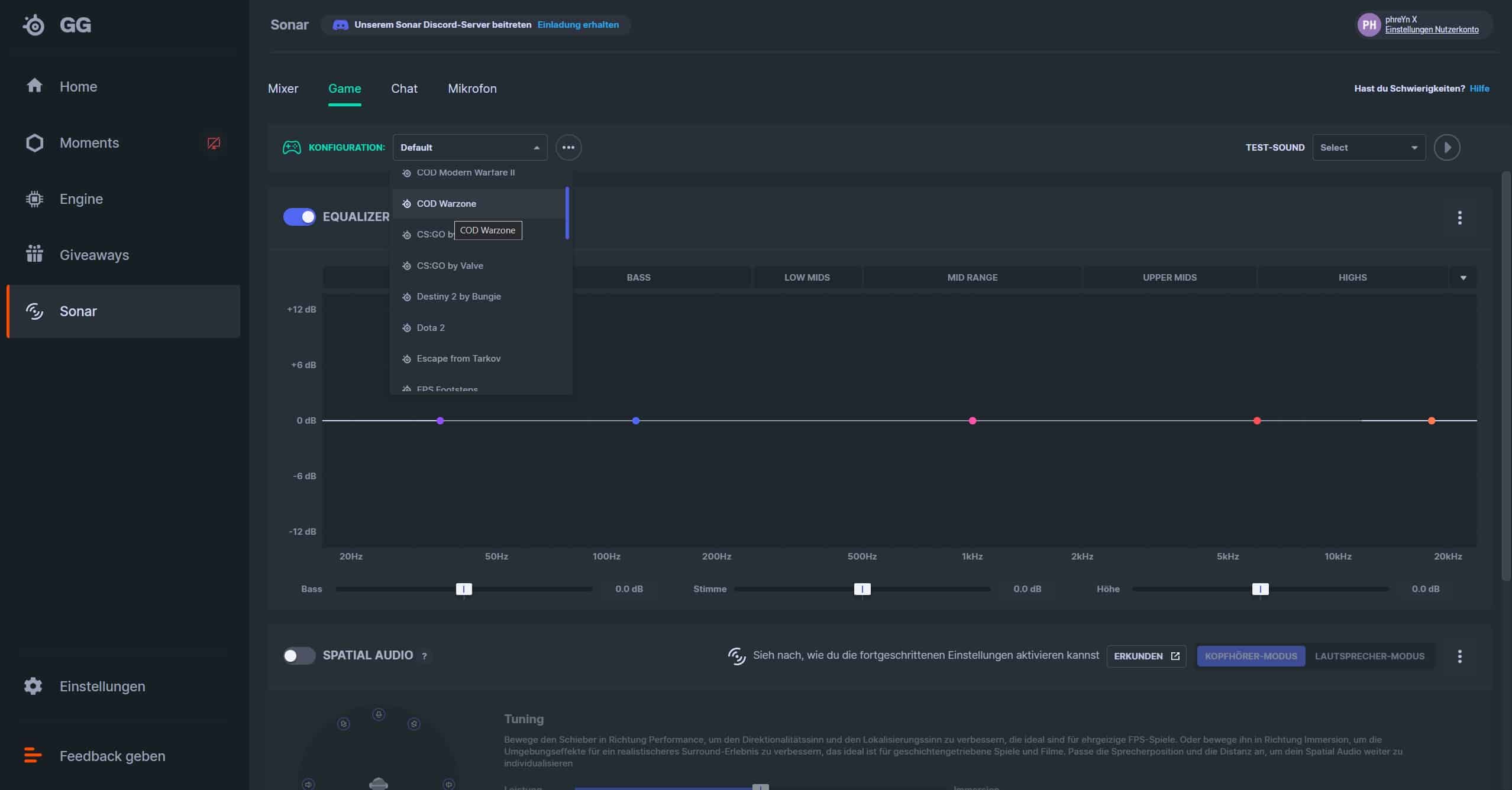 Hier wählst du links im Menü den Punkt Sonar aus und bekommst derart umfangreiche Anpassungsmöglichkeiten, die sonst kein anderer Hersteller bietet. Von einem bis in die Nachkommastelle anpassbaren 10-Band-Equalizer über verschiedene Presets für unterschiedliche Titel oder Genres bis hin zu Spatial Audio oder einer Klangverstärkung kannst du den Sound für die Wiedergabe feinjustieren.