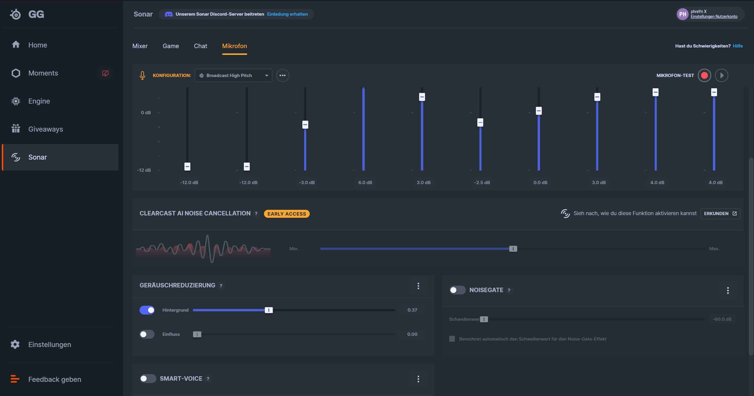 Auch hier offenbart die Sonar-Software weitere Stärken, da du verschiedene Presets auswählen kannst, die enorme Auswirkungen auf die Mikrofonqualität haben. Zudem schaltest du hier eine KI-gestützte Geräuschunterdrückung hinzu, die trotz Early-Access-Status einen tadellosen Job verrichtet.
