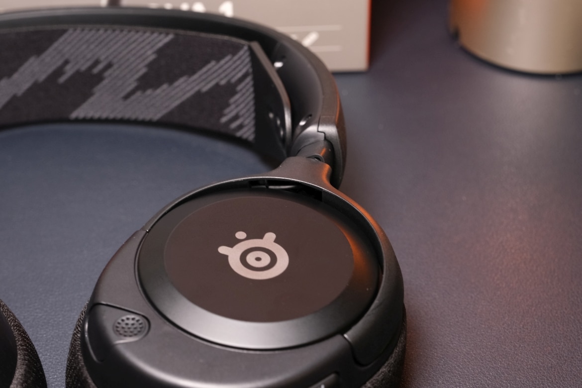 SteelSeries setzt bei den Materialien seines Einsteiger-Headset auf Plastik, wobei vor allem die Formgebung der Ohrmuscheln die neue Arctis Nova-Designsprache widerspiegelt. Außen auf den Ohrmuscheln findest du ein silbern abgesetztes Herstellerlogo, der Rest der Headsets präsentiert sich in schlichtem, mattem Schwarz.