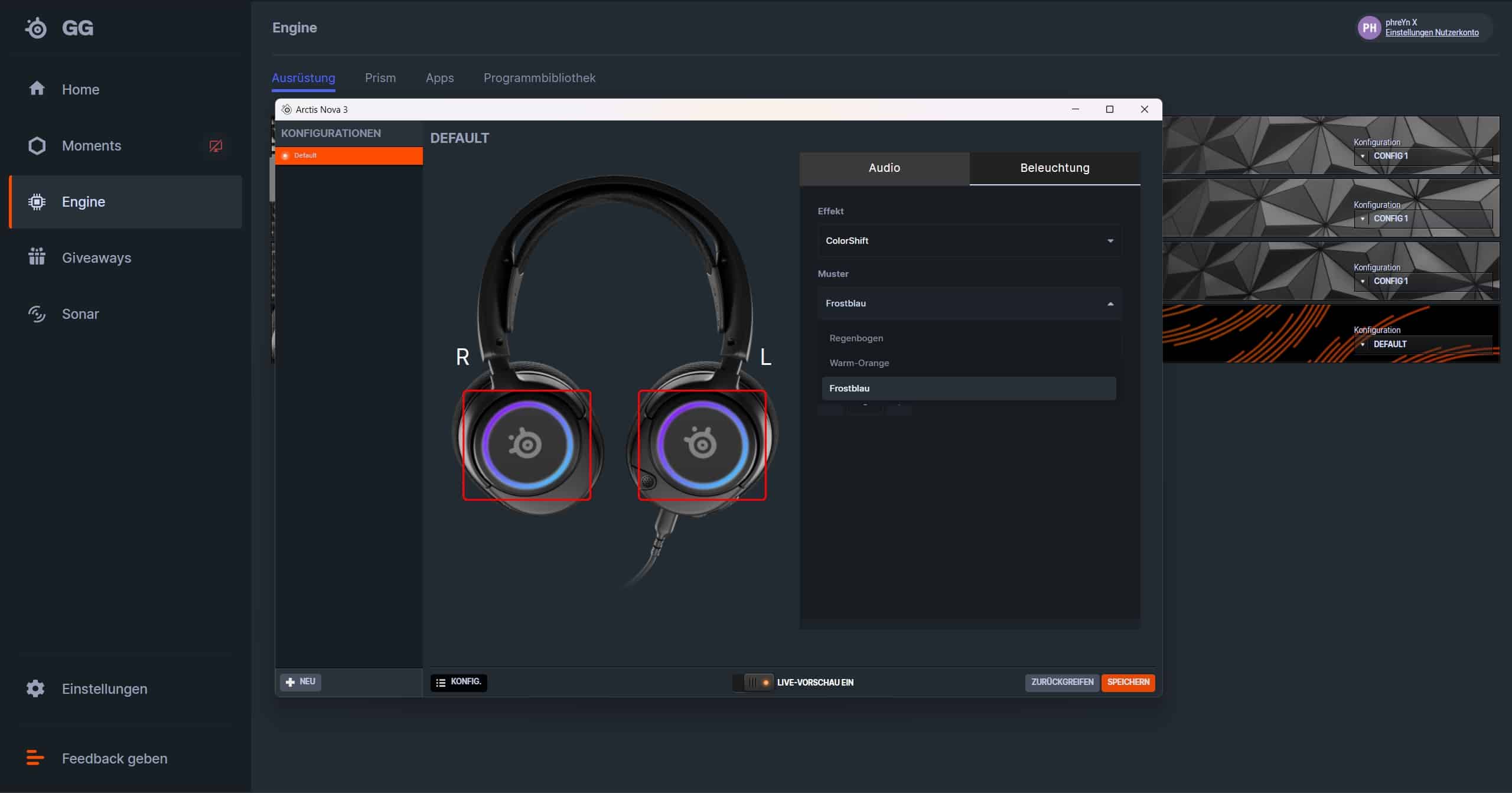 Eine Besonderheit des Arctis Nova 3 ruht natürlich in der anpassbaren PrismSync-RGB-Beleuchtung. Doch um diese mit individuellen und bis ins kleinste Detail anpassbaren Beleuchtungseffekten bestücken zu können, benötigst du ebenfalls die Begleit-Software.