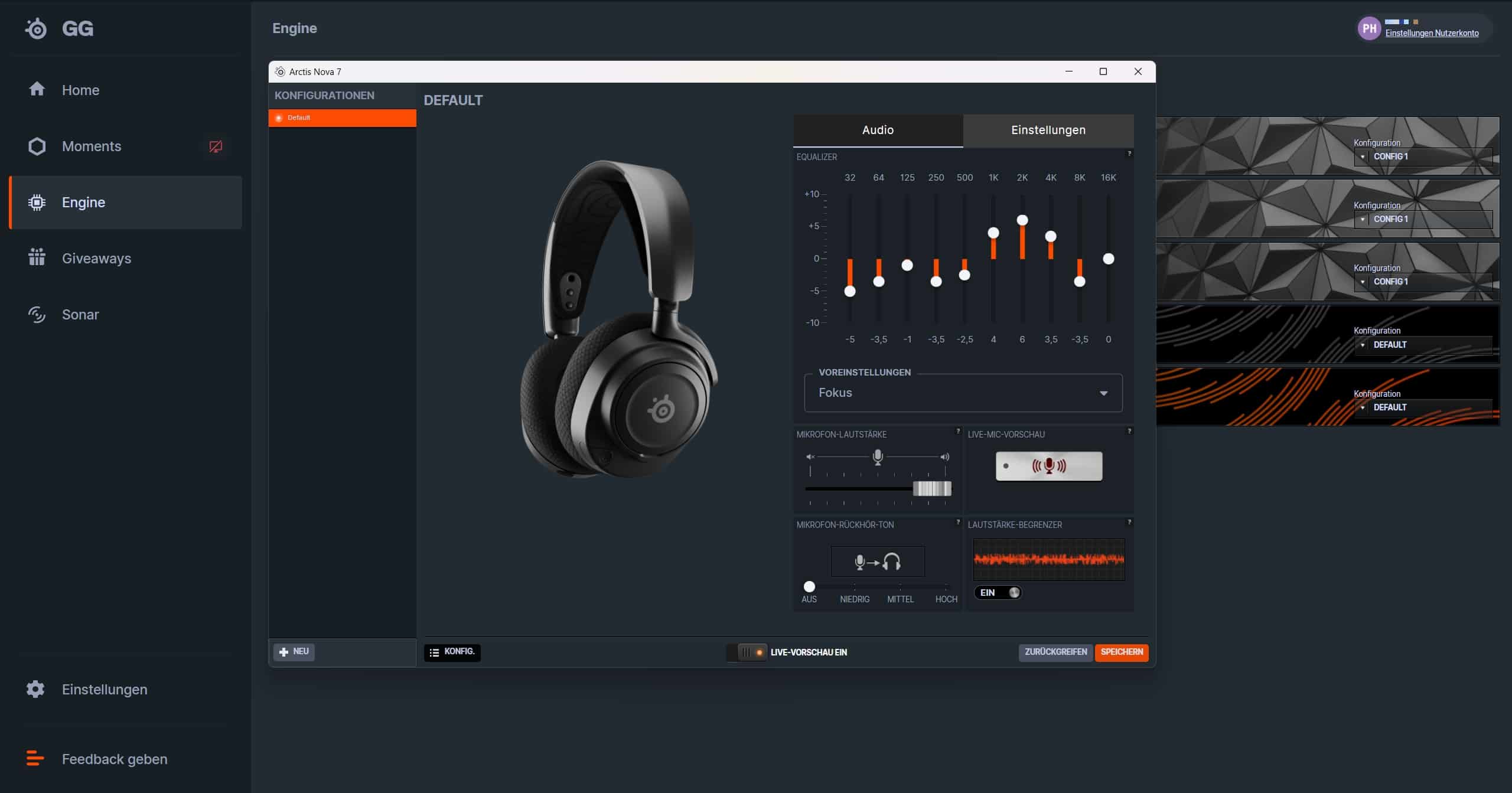 Die normale Begleit-Software SteelSeries GG bietet die üblichen Einstellungsmöglichkeiten wie Equalizer, Mikrofon-Sidetone oder Anpassung der Mikrofon-Lautstärke. Zudem kannst du hier beispielsweise einstellen, wann sich das Headset nach Inaktivität selbst ausschalten oder wie es auf einen eingehenden Anruf reagieren soll.