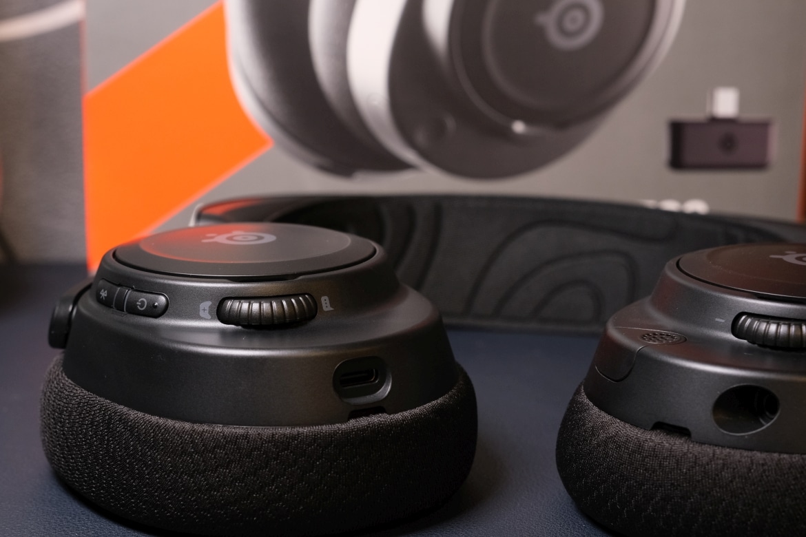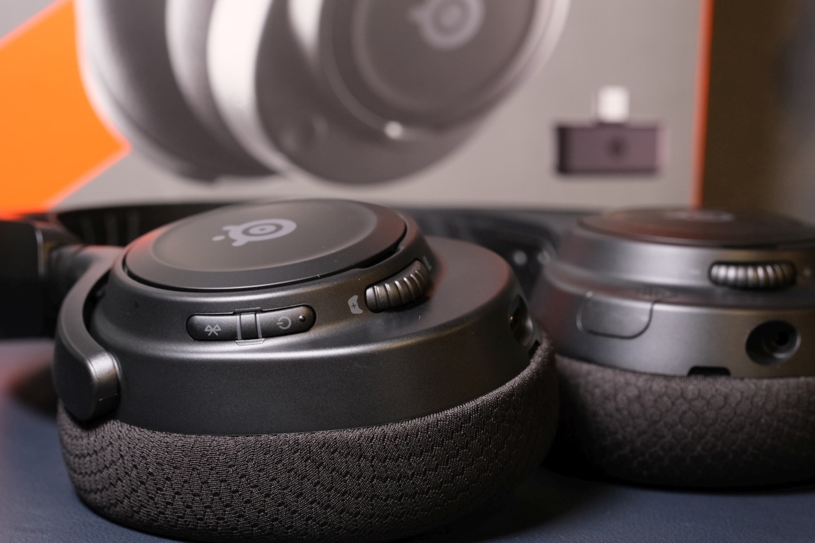 Auch die Bedienelemente orientieren sich an denen des Nova Pro Wireless, mit gewissen Unterschieden. So findest du an der linken Seite Lautstärkedrehrad, Stummschalttaste und das vollständig versenkbare Mikrofon, sowie den 3,5-mm-Klinkenanschluss. Rechts hingegen sitzen der USB-C-Port, die Ein- und Ausschalttaste, der Bluetooth-Button, sowie ein Drehrad, um Spiel- und Chatlautstärke entsprechend zu justieren.