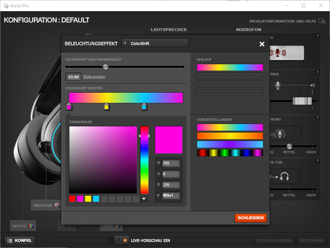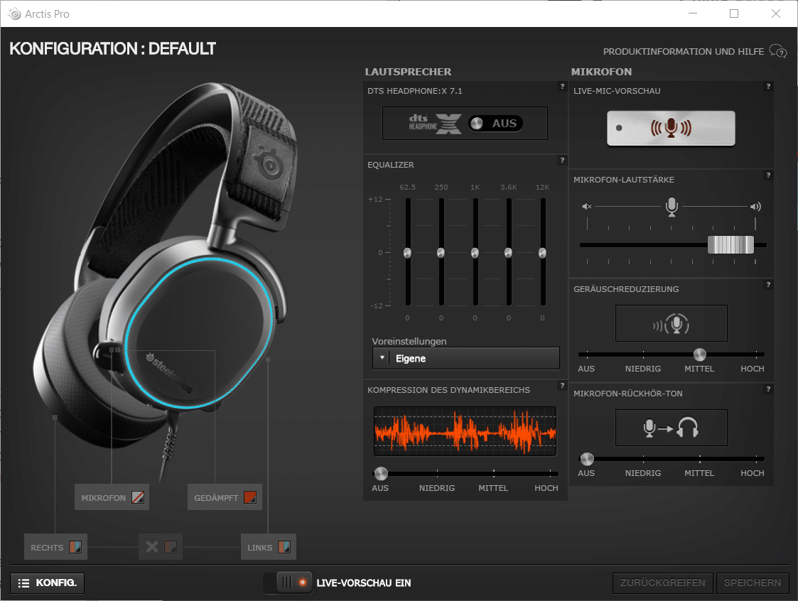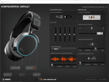 Eine Registrierung wie etwa beim Arctis 3 ist nicht notwendig, um die SteelSeries Engine 3 zu nutzen. Das Headset wird digital per USB angeschlossen und somit automatisch erkannt. In den Einstellungen findet ihr neben der Beleuchtung auch DTX Headphone:X v2.0, für den virtuellen 7.1-Sound. Außerdem können noch diverse weitere Einstellungen für das Mikrofon und die Treiber vorgenommen werden.