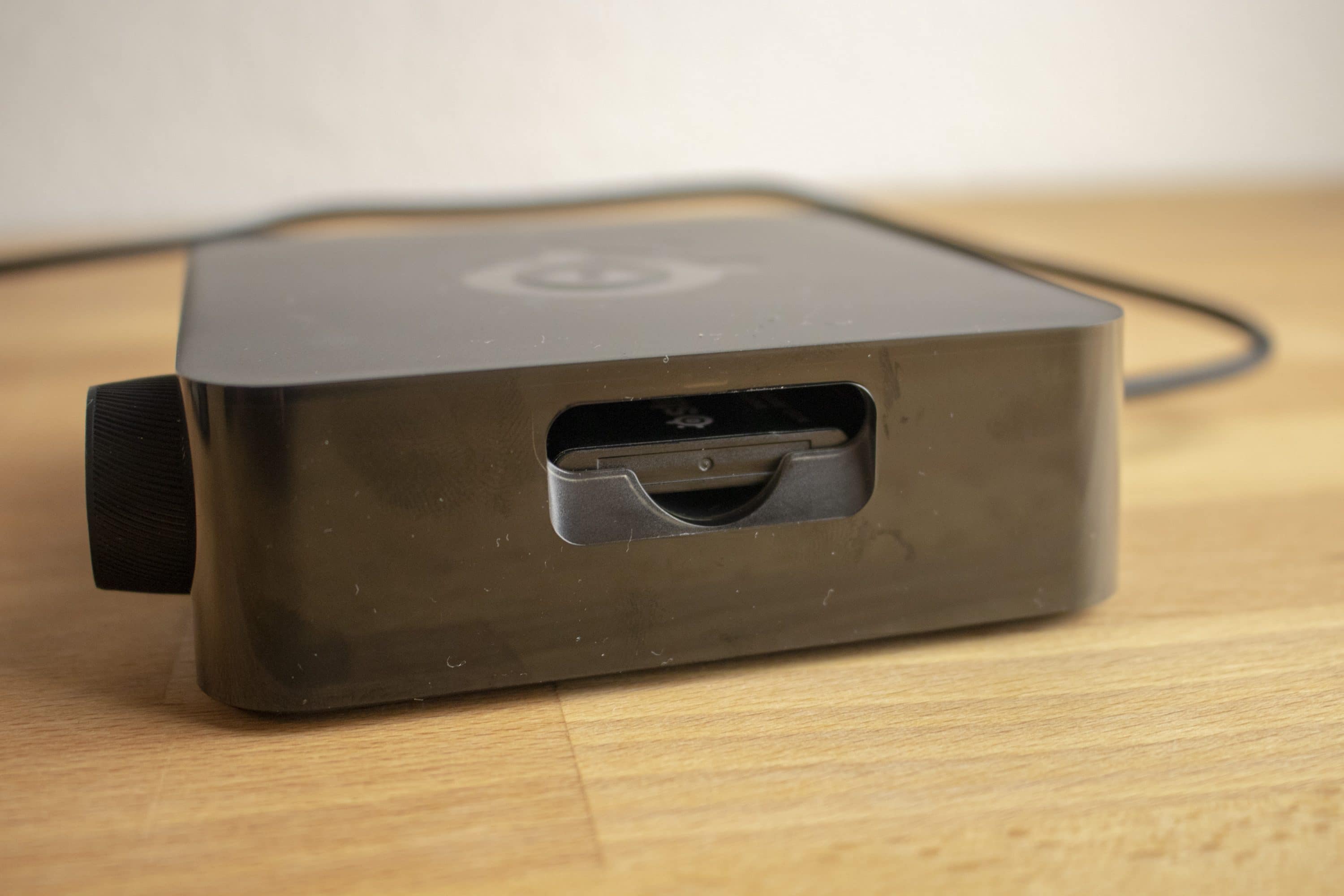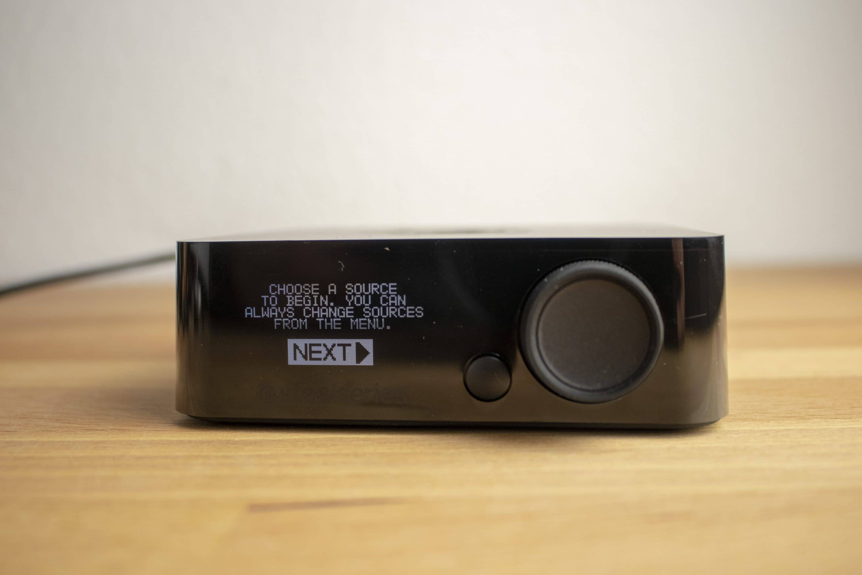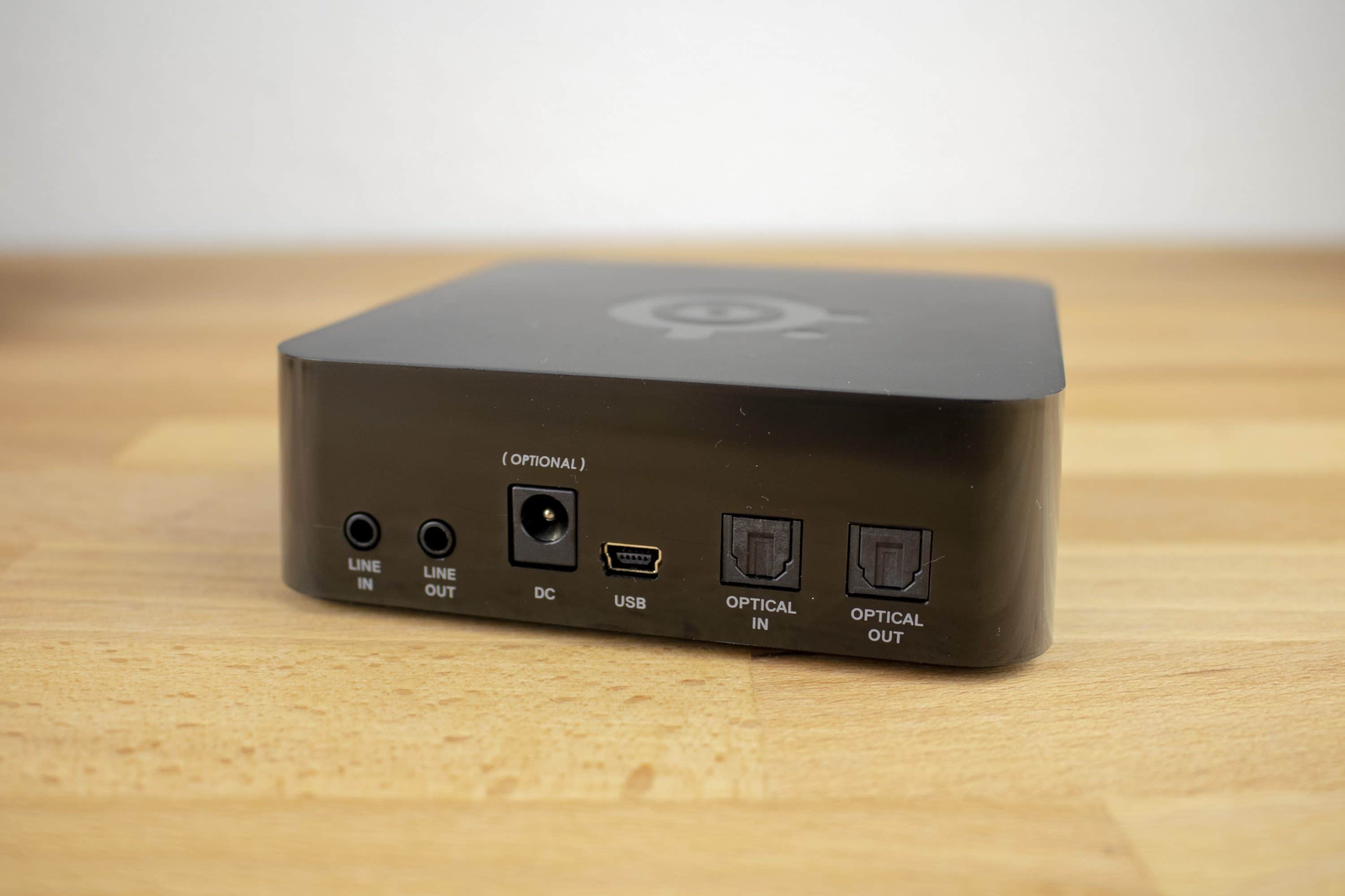 Beider Senderstation handelt es sich um eine kleine Box, die an ein oder mehrere Ausgabegeräte angeschlossen werden kann. Sie verfügt über einen Drehregler und ein OLED-Display. Rückseitig verfügt sie zudem über diverse Anschlüsse. Die zugehörigen Kabel werden direkt mitgeliefert. Neben USB und Klinge gibt es auch optische Ein- und Ausgänge. Hierüber ist auch das Durchreichen des Audiosignals an ein Soundsystem möglich. Leider kann die Lautstärke dort jedoch nicht über die Senderstation gesteuert werden, sondern nur über die Audioquelle (z. B. den PC).