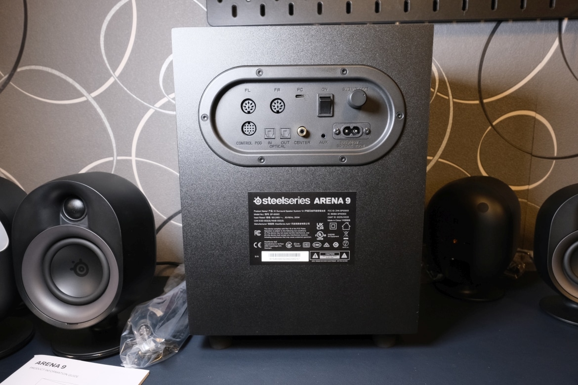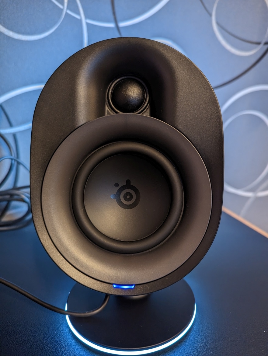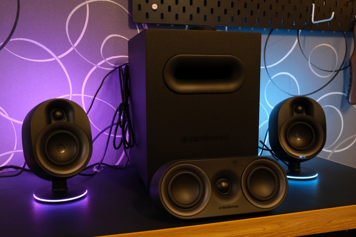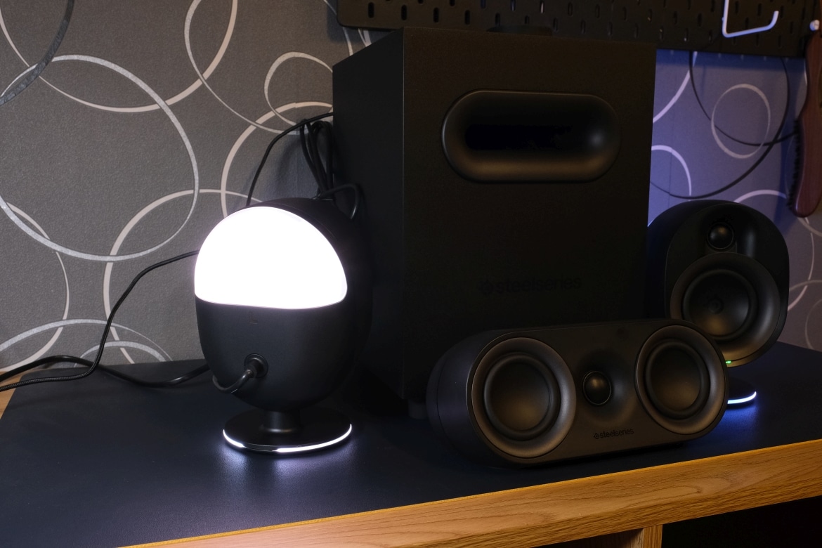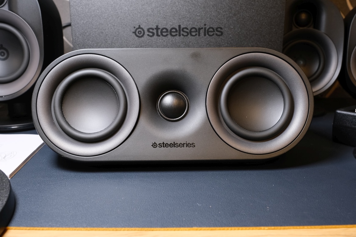Die matt-schwarze Kunststoffoberfläche erinnert dabei an andere Produkte aus dem Hause SteelSeries. Dabei präsentieren sich die Treiber der Lautsprecher offenliegend, während der Subwoofer nach unten strahlt.