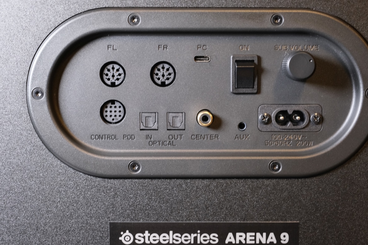Am Subwoofer erfolgt dann via USB-Type-C auch die Verbindung zum PC oder zu PlayStation-Konsolen, gleichzeitig wird das SteelSeries Arena 9 hier eingeschaltet.