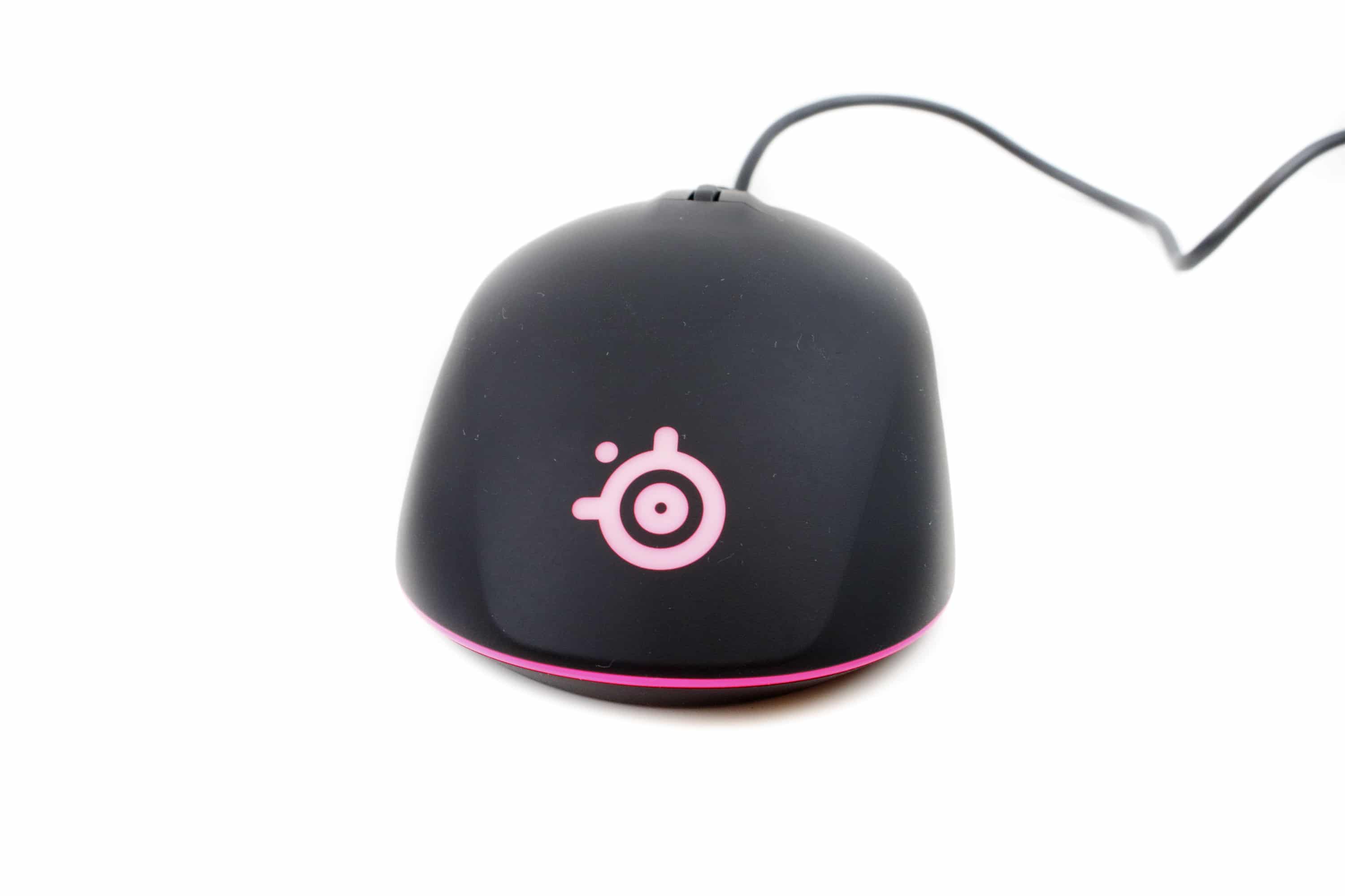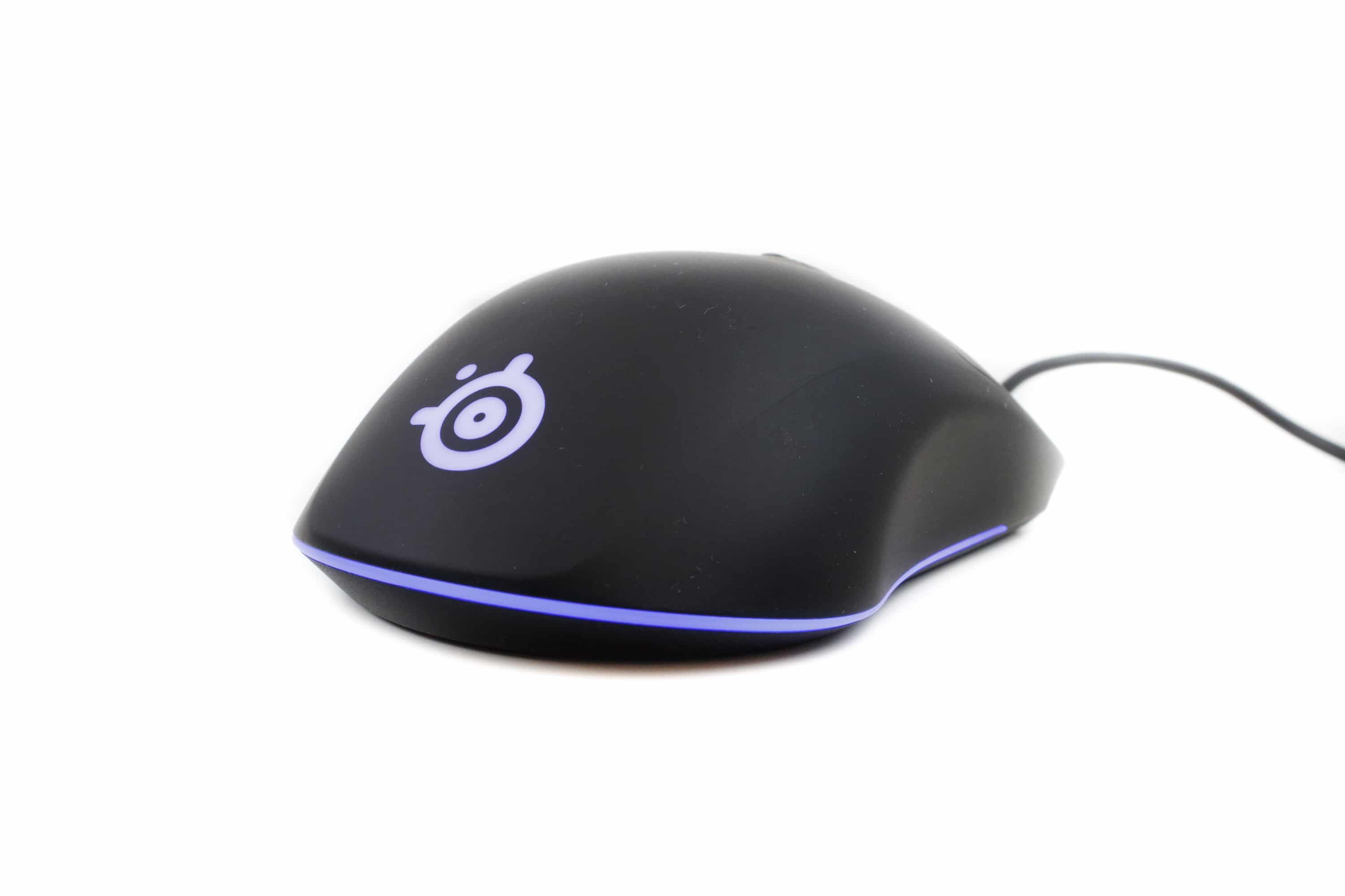 Das mattschwarze Gehäuse aus ABS-Kunststoff fühlt sich angenehm an und liegt rutschfest in der Hand. Trotz Verzicht auf Gummierung der Seiten. Bis auf die integrierte RGB-Beleuchtung ist das Mausgehäuse sehr dezent gehalten. Die RGB-Beleuchtung dagegen verwandelt die Maus in einen Hingucker. So ist sie mit einem Leuchtring umgeben, der fast um die gesamte Maus geht. Aufgeteilt ist er in drei Zonen, wovon die hinterste auch das im Mausrücken integrierte SteelSeries-Logo beinhaltet. Das hat uns ein wenig gewundert, denn meistens sind die Logos dediziert einstellbar.