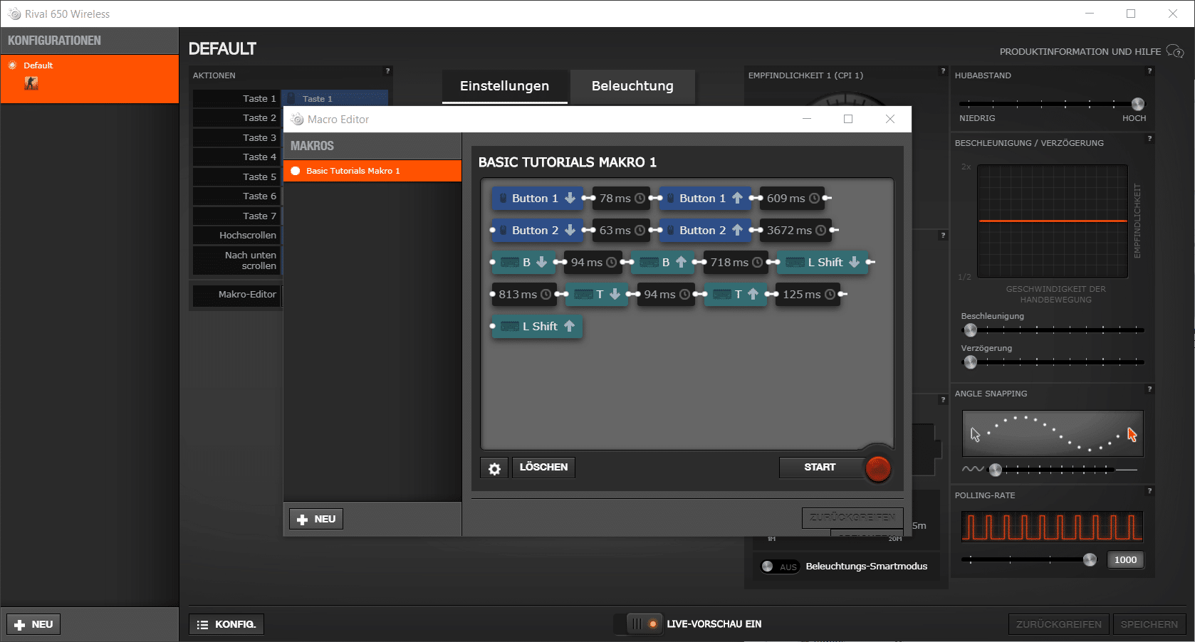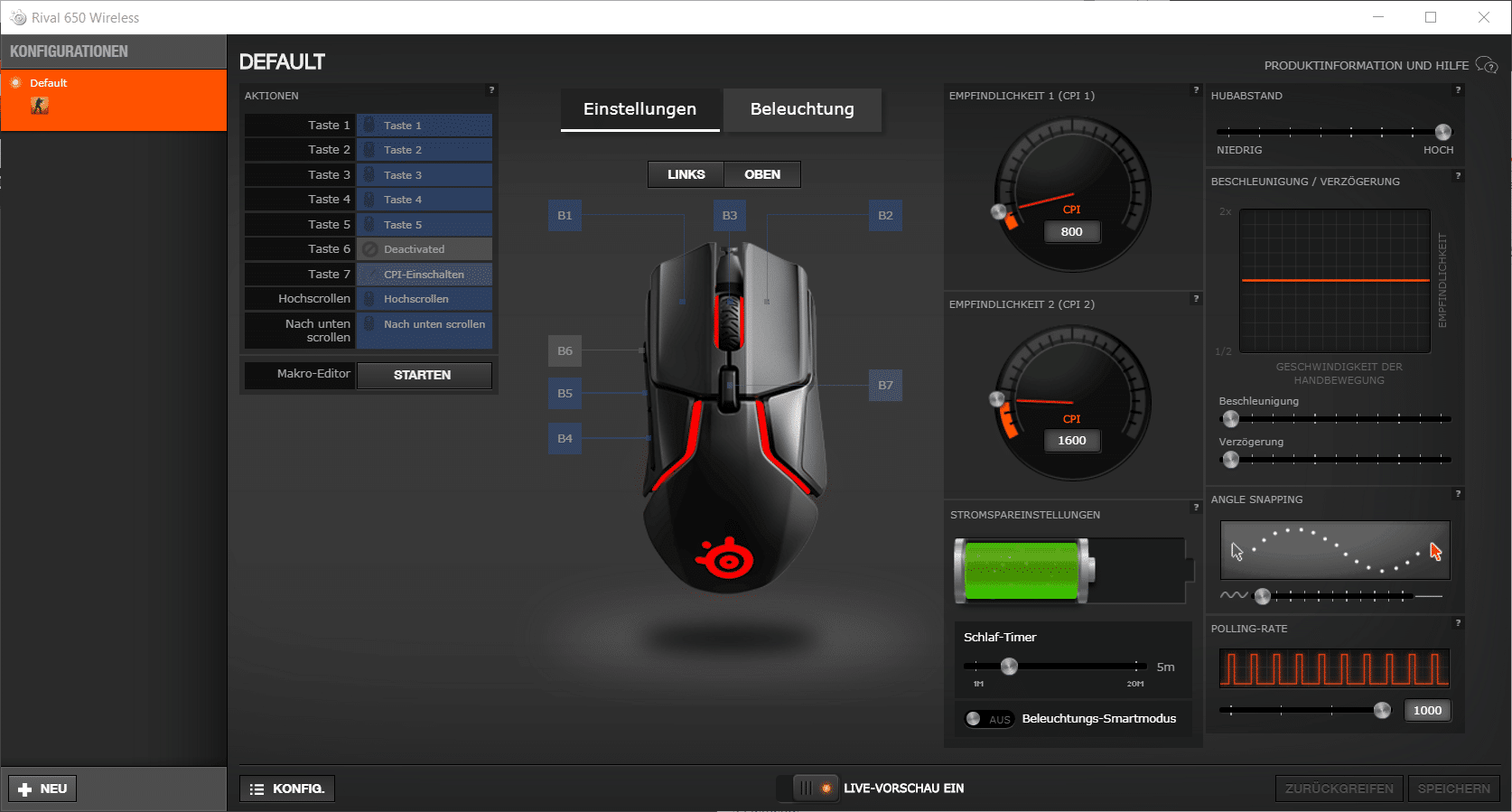 Die zur Maus gehörige Software steht auf der Internetseite des Herstellers zum kostenlosen Download und bietet etliche Möglichkeiten, Einfluss auf das Gerät zu nehmen. Vom Programmieren aller sieben zur Verfügung stehenden Tasten über das Einstellen der Sensibilität des zweiten Sensors bis hin zum Regeln der DPI ist hier beinahe alles möglich.