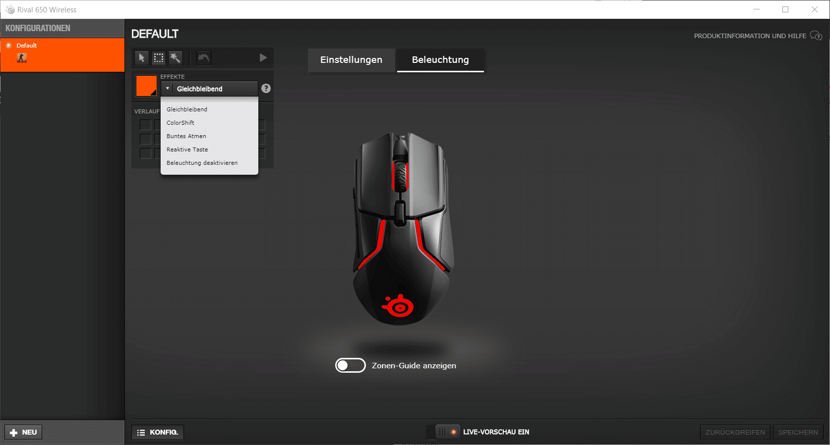 Die Beleuchtungsoptionen können bis ins kleinste Detail individualisiert werden. Verglichen mit den Angeboten anderer Hersteller ist die Engine von SteelSeries insgesamt sehr umfangreich und bietet dem Nutzer weitreichende Freiheiten.