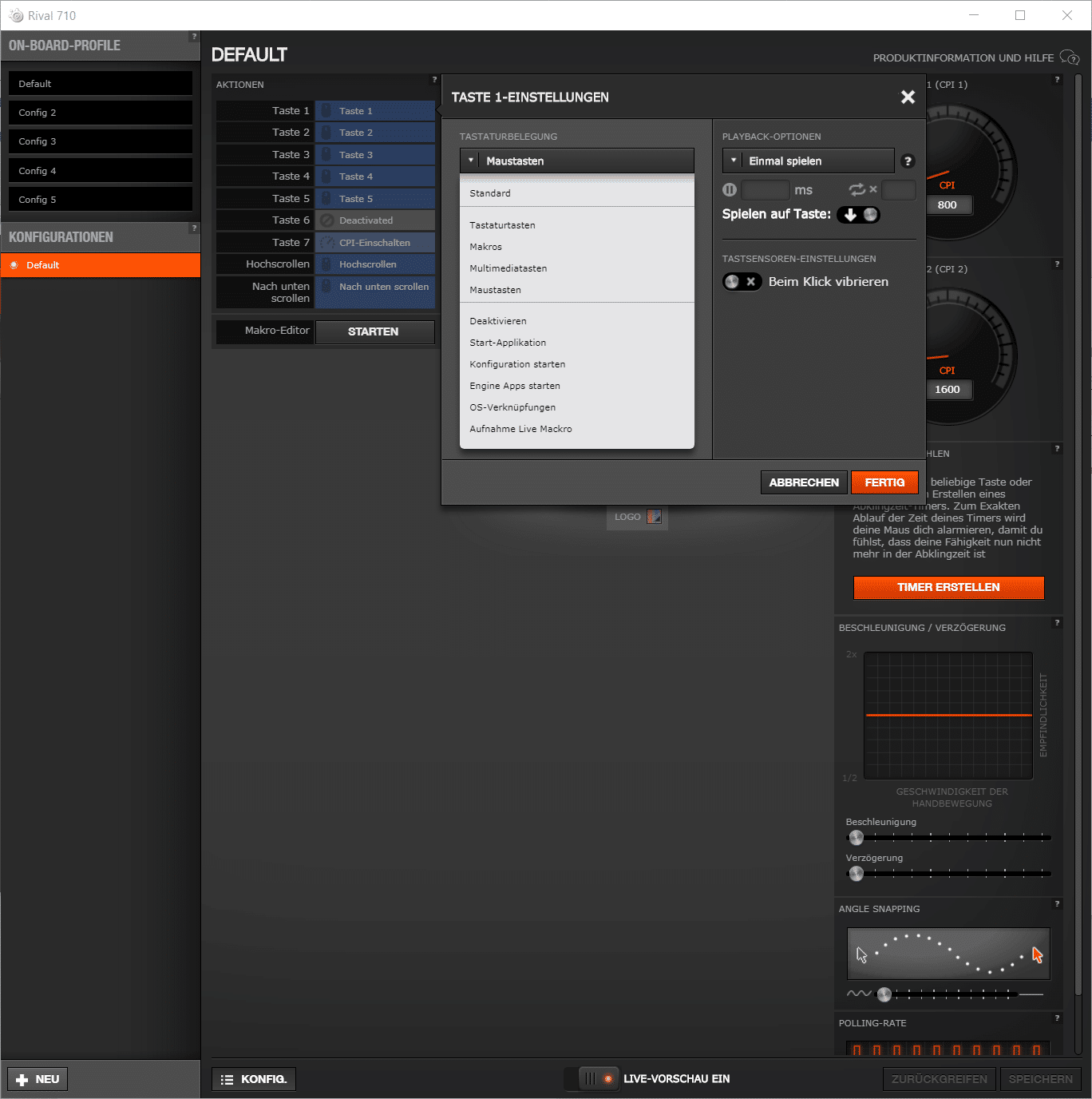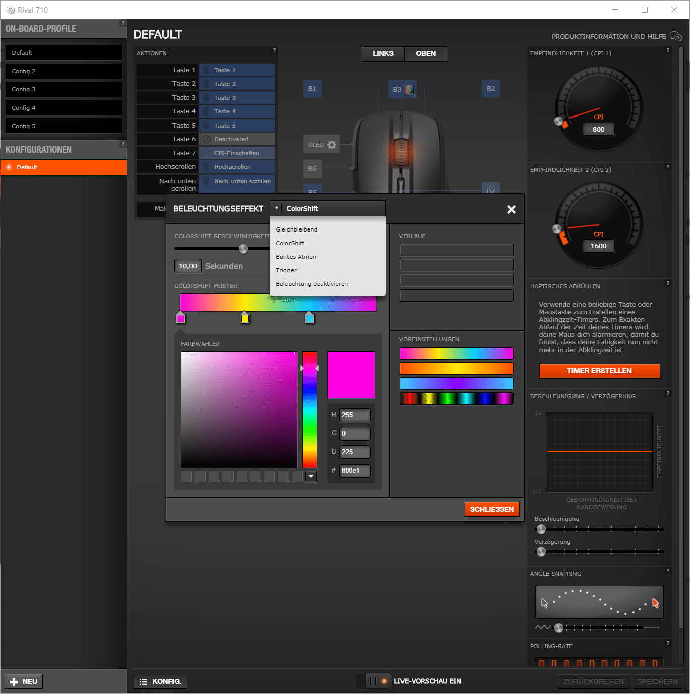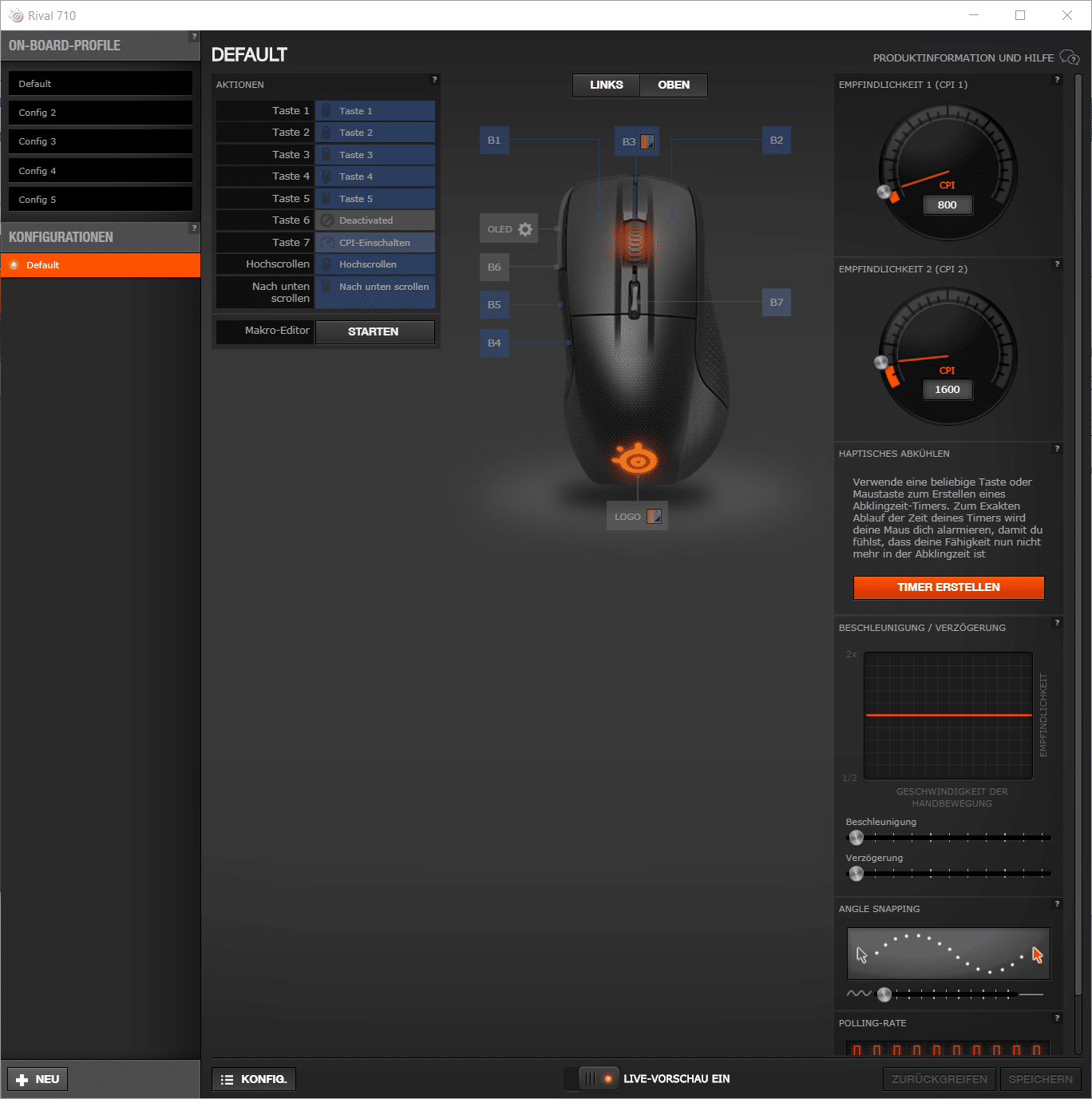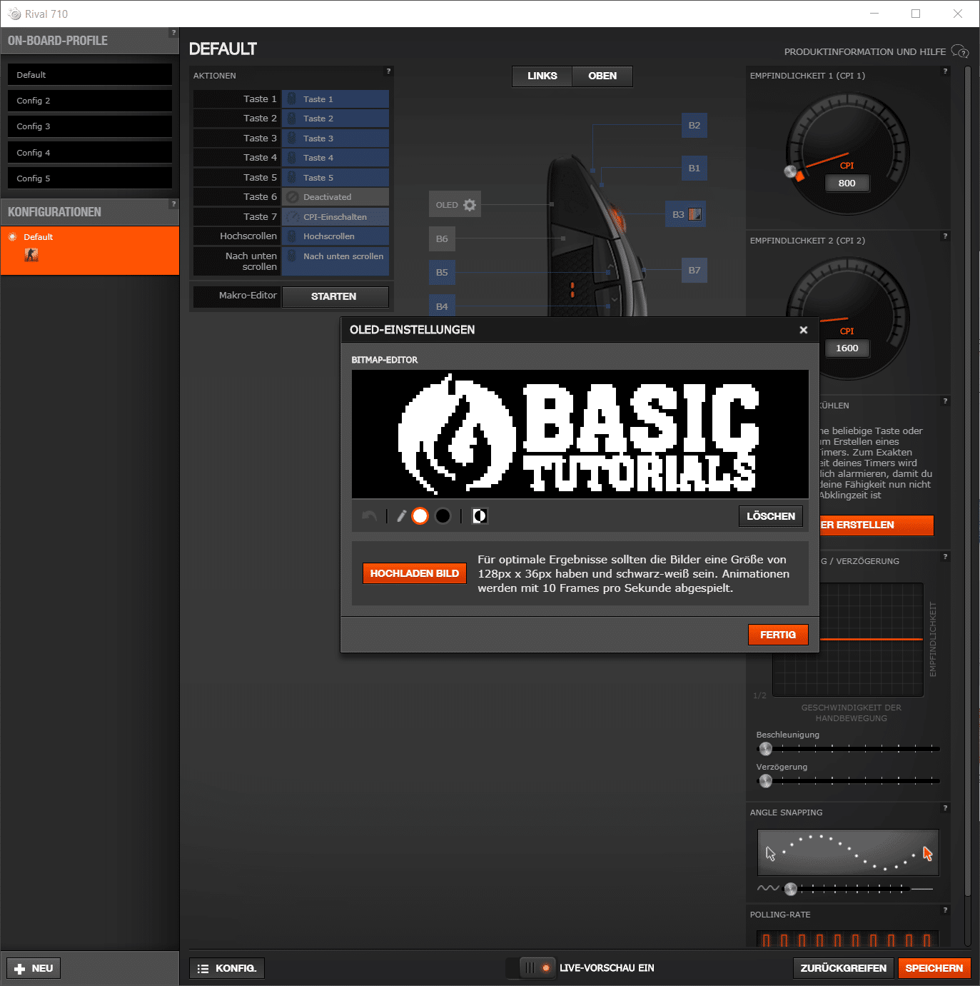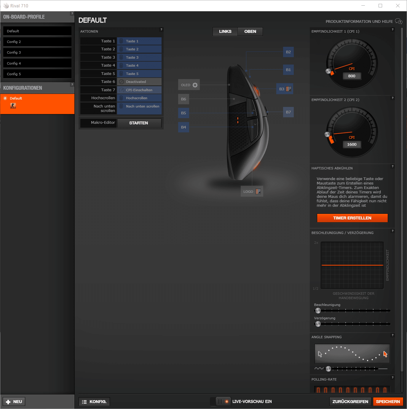Die persönliche DPI-Zahl der Maus kann – auch in Abhängigkeit vom jeweiligen Spiel – eingestellt werden, Mausbeschleunigung und Mauskorrektur lassen sich ein- und ausschalten und die Tasten der Maus können individuell belegt werden. Hierzu stehen intuitiv verständliche Regler und Knöpfe bereit. Auch die RGB-Beleuchtung kann hier selbstverständlich eingerichtet werden.