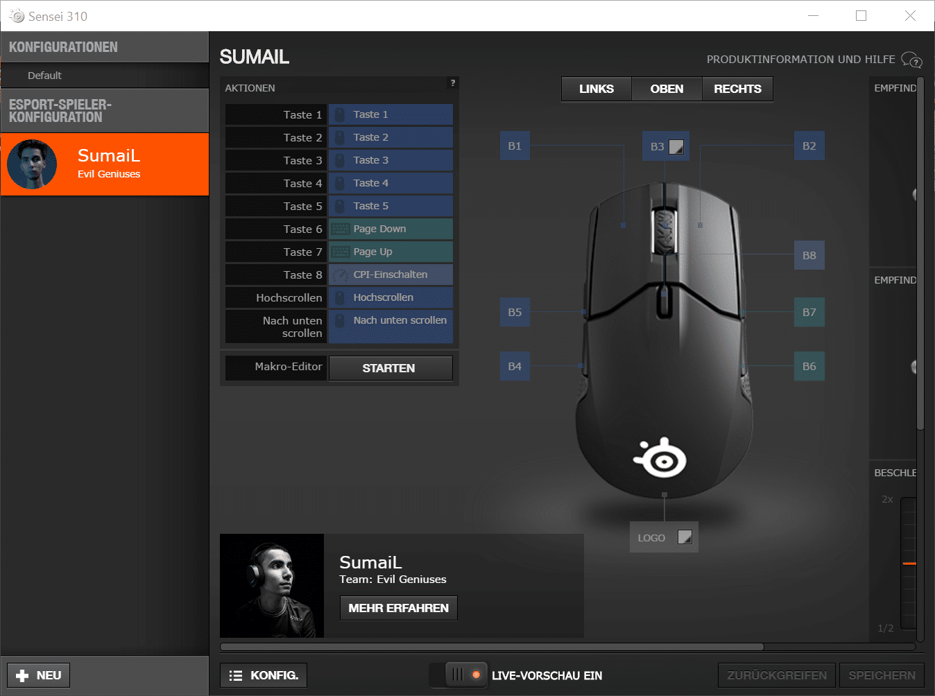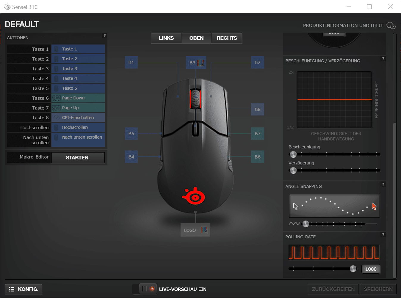 Tastenbelegungen, dpi-Raten und weitere individuelle Einstellungen können über die „Engine Software“ von SteelSeries vorgenommen und im internen Speicher der Sensei 310 gespeichert werden.