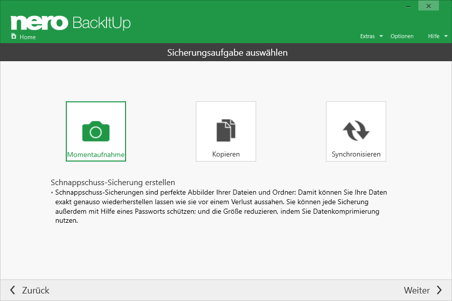 Als leichtgewichtige Backup-Lösung für Windows-Systeme bietet Neros BackItUp die nötigsten Optionen für eine komplette oder teilweise System-Sicherung. Dabei können verschiedene Arten von Sicherungen gewählt werden, eine Momentaufnahme, eine Kopie und eine Synchronisation. Die gängigste Variante ist laut Nero die direkte Kopie der Dateien, welche dann entweder manuell oder mit einem Zeitplan fortlaufend aktualisiert werden kann. Hierbei werden dann nur veränderte Dateien und nicht sämtliche Dateien erneut kopiert, was den Zeitaufwand erneuter Backups deutlich reduziert. Auf diese Weise arbeiten auch Anwendungen anderer Anbieter.