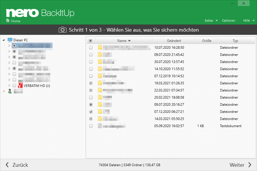 Getestet haben wir den Backupvorgang mit der Option Kopieren und einer größeren Sicherung von 136 Gigabyte mit Daten von mehreren Datenträgern. Die Auswahlmöglichkeit der einzelnen Dateien war dabei sehr flexibel, es lassen sich gezielt nur die gewünschten Unterordner auswählen.