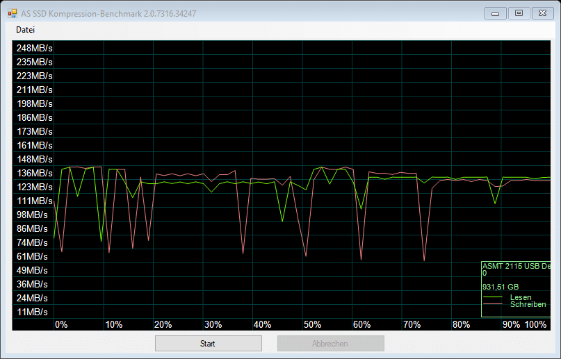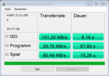 Nach einem zeitlich sehr ausgedehnten Testlauf, zeigten sich hierbei für eine 2,5-Zoll-HDD-Festplatte gute Transferraten von ca. 140 MB/s beim sequentiellen Lesen und 123 MB/s beim sequentiellen Schreiben.