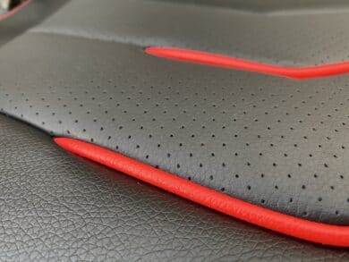 Das Alphaeon S3 wurde so gestaltet, dass an zahlreichen Stellen für zusätzlichen Komfort und Luxus gesorgt wird. Dabei spielt die Verarbeitung der Oberfläche und der Schaumstoff darunter eine zentrale Rolle. Die Oberfläche besteht aus PU-Kunstleder, dass sich optisch und haptisch kaum von echtem Leder unterscheidet. Jedes einzelne Lederstück ist dabei mit gut aussehenden und dezenten roten Fäden verbunden. Dieses „dezente Design“, welches an Luxus-Sportwagen angelehnt ist, finden wir beim gesamten Gaming-Stuhl wieder. Weitere rot hervorgehobene Akzente findet man in der Mitte der Sitzfläche sowie in der Mitte der Rückenlehne wieder. Außerdem ist das Kopfkissen mit einem roten Tesoro-Schriftzug versehen und rundet das Gesamtpaket ab. In den mittleren Bereichen der Sitzfläche ist das Leder gelöchert und sorgt damit für eine bessere Belüftung der wichtigsten Zonen, die für Schweiß anfällig sind.