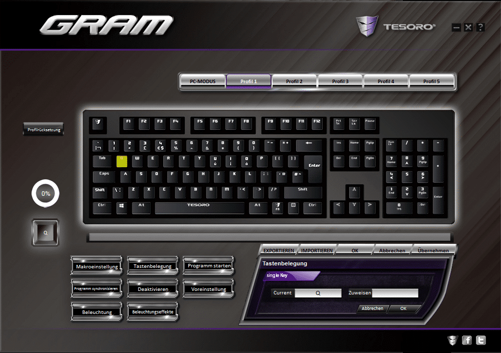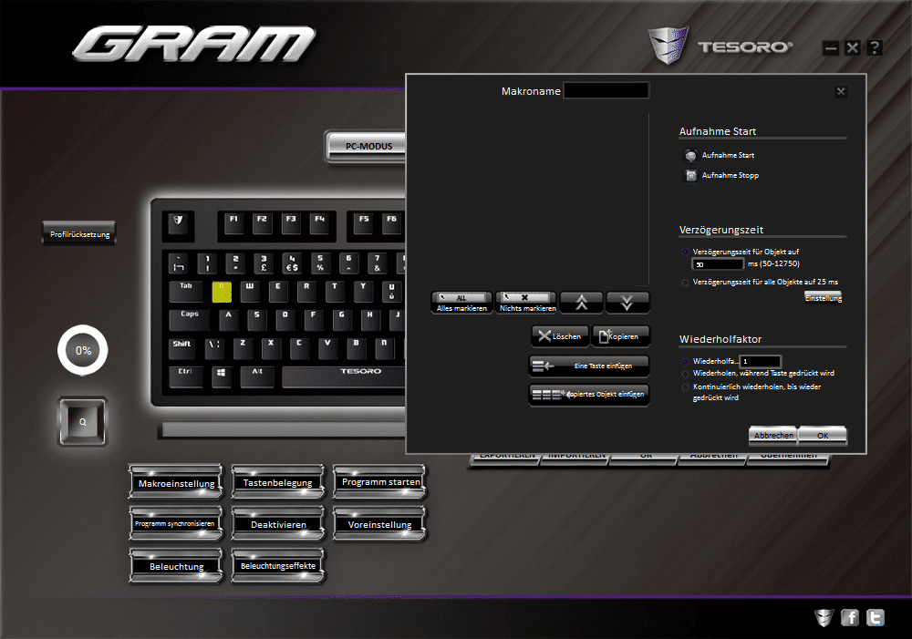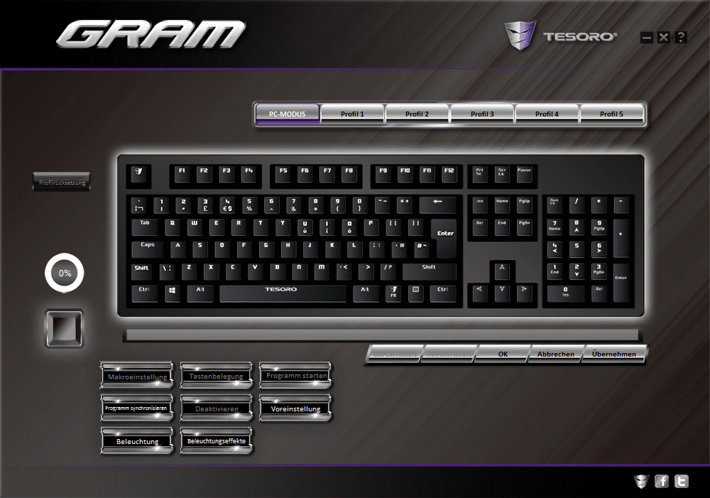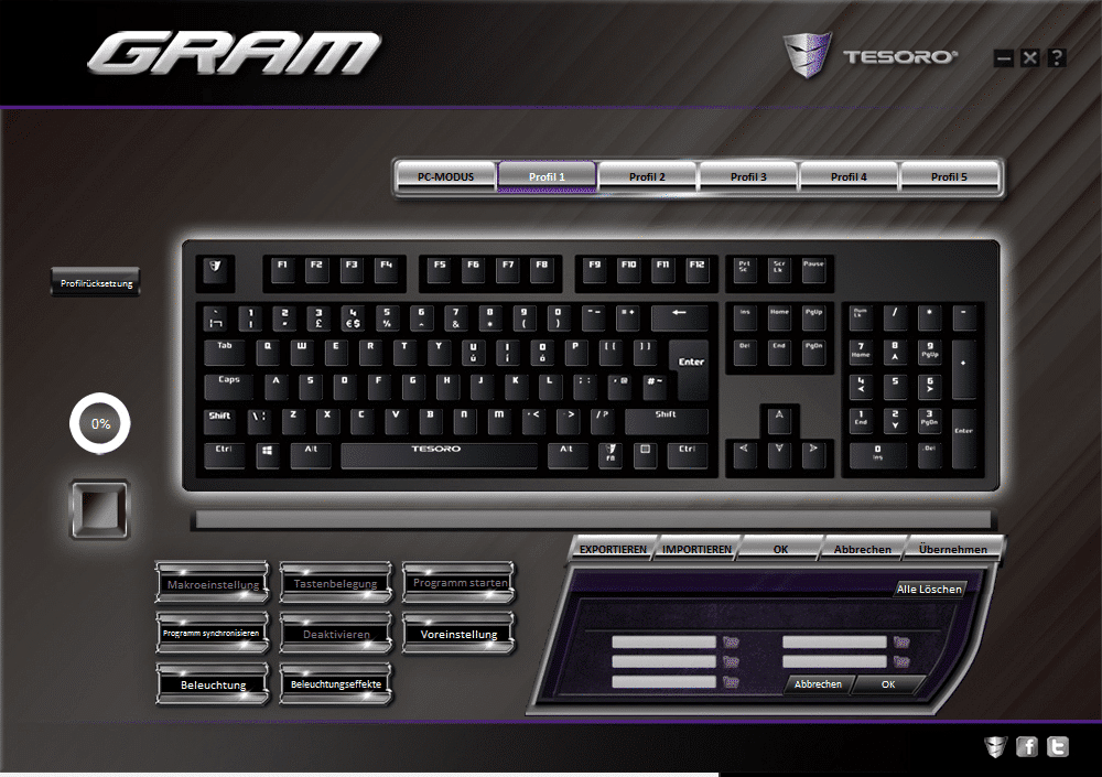 Die Software ist zwar übersichtlich, weißt jedoch einige Fehler auf (beispielsweise sind manche Buttons nicht klickbar). Schade ist außerdem, dass man weder die Farbe jeder einzelnen Taste einstellen kann, noch per Instant Recording aufgenommene Makros nachträglich bearbeiten kann. Diese werden einfach gar nicht in der Software angezeigt. Ich bin leider sehr unzufrieden mit dem Treiber und hoffe, dass Tesoro da bald nachliefert.
