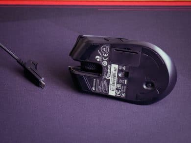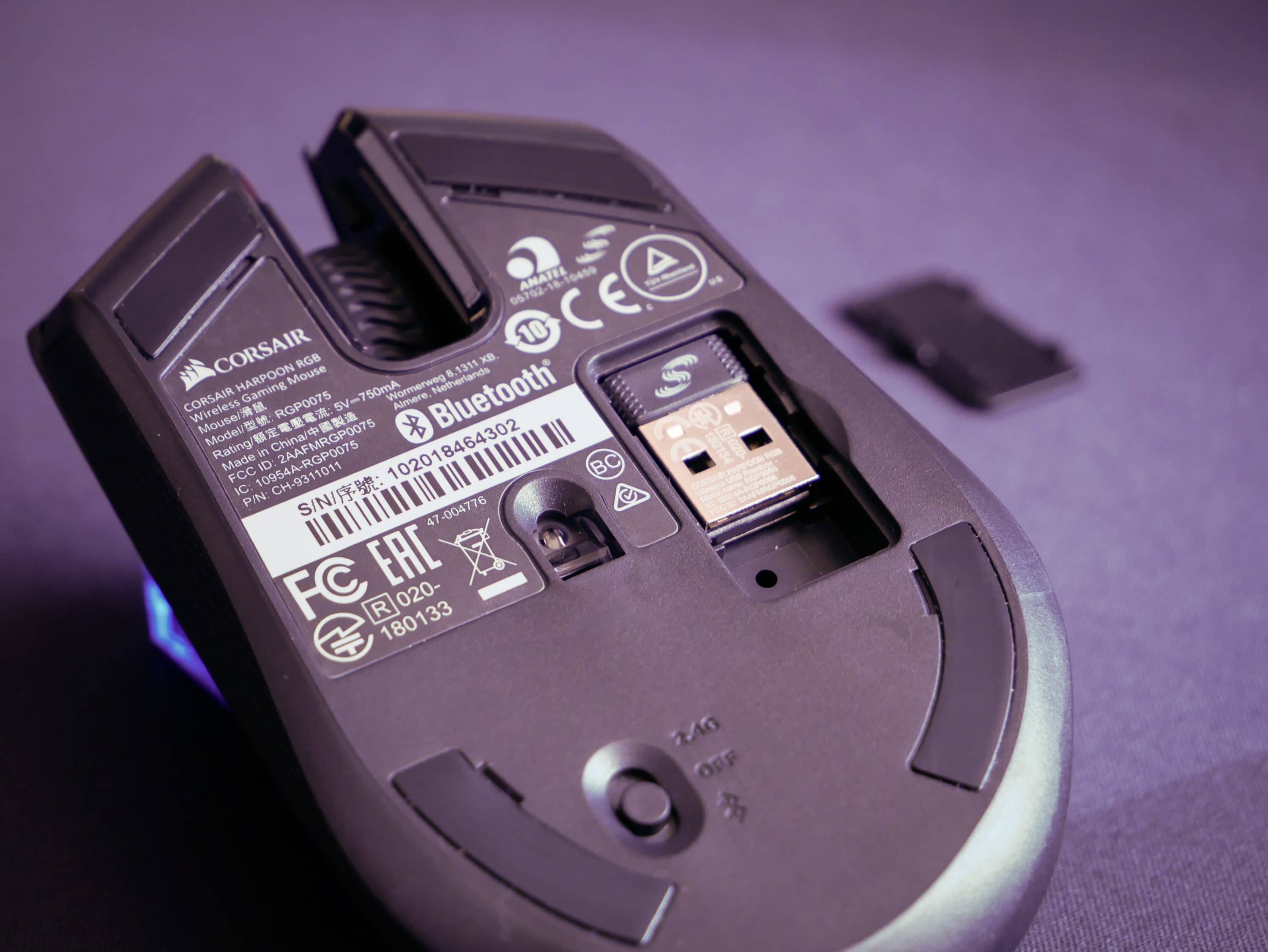 In der kompakten Maus steckt eine Menge Technik. Mit der neuen Slipstream Technologie von Corsair ist während der Benutzung kein Unterschied zu einer kabelgebundenen Maus zu bemerken. Im Test konnte kein Lag festgestellt werden. Praktisch ist, dass der 2,4 GHz Funkempfänger direkt in der Maus Platz findet. So kann er immer mitgenommen werden und geht nicht verloren. Wer aber unterwegs auf einen Dongle verzichten will kann die Harpoon RGB Wireless auch über Bluetooth betreiben. Das ist großartig, weil man sie so zu Hause als Gaming-Maus oder mit einem Notebook auf Reisen einfach nutzen kann.