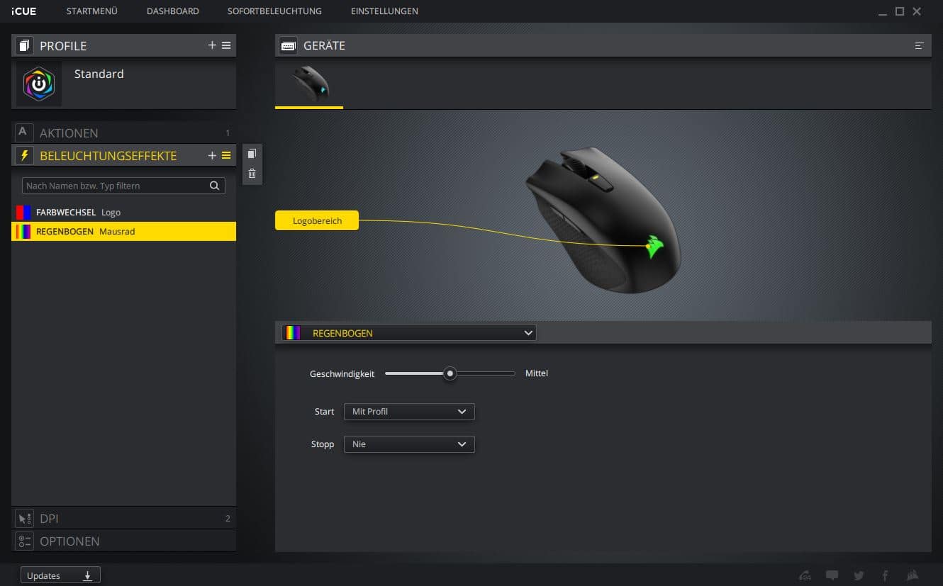 Corsair bietet mit der iCUE-Software eine umfassende Lösung, um alle seine Produkte, seien es Maus, Tastatur oder Lüfter, zu konfigurieren. Dazu lassen sich alle einzelnen Geräte, die über eine RGB-Beleuchtung verfügen, miteinander synchronisieren. Dabei ist die Software stets klar und einfach zu bedienen.