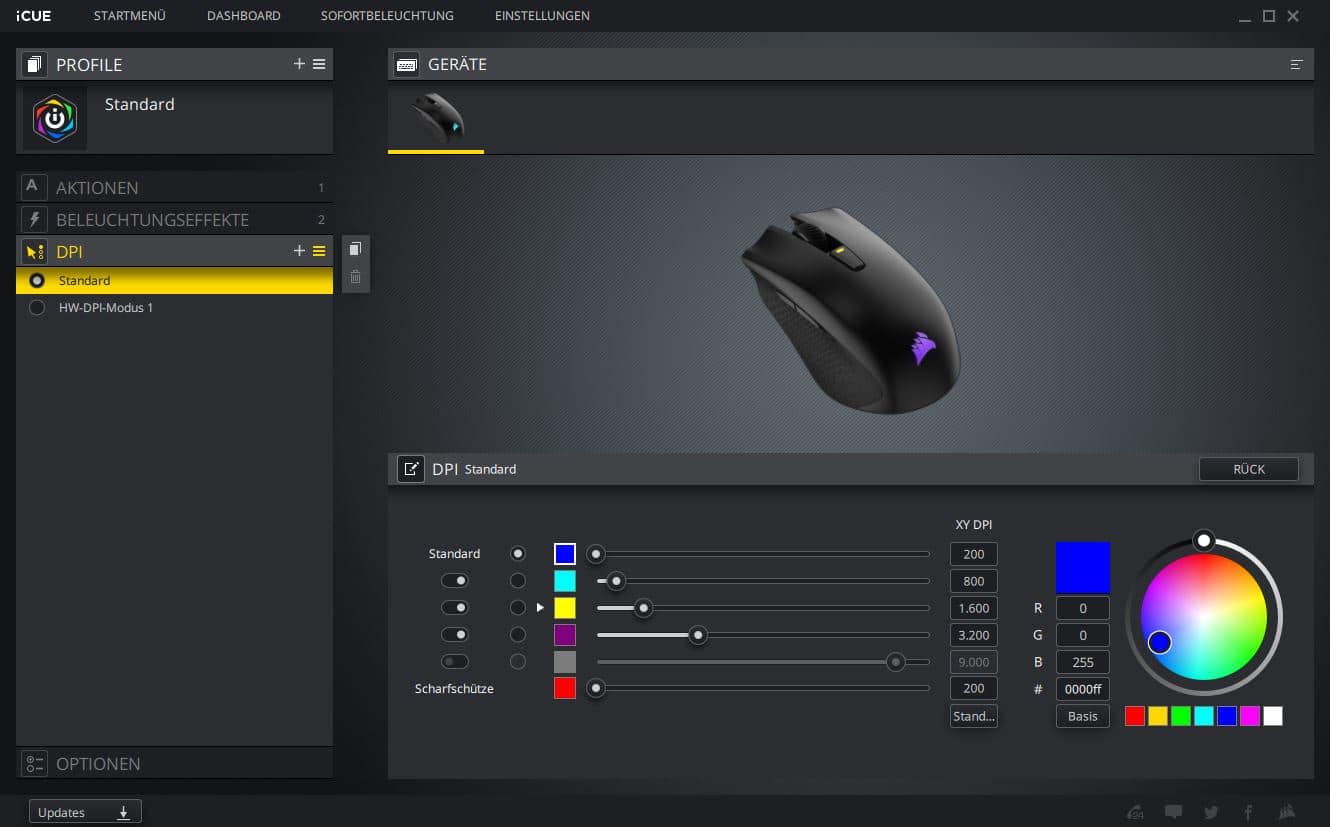 Auf der linken Seite kann man auf alle unterschiedlichen Einstellungen zugreifen. Unter „Aktionen“ kann man z.B. fast allen Tasten Makros zuweisen oder andere Tasten der Tastatur remappen. Im Reiter „Beleuchtungseffekte“ lässt sich die RGB-Beleuchtung nach belieben einstellen. Ob Regenbogeneffekt, ein einfacher Farbwechsel oder pulsierende Farben, alles kann individuell angepasst werden. In der „DPI“ Sektion lässt sich, wie der Name schon vermuten lässt, die Empfindlichkeit der Maus einstellen. Dabei kann man sechs unterschiedliche Presets mit Werten von 200 bis 10.000 DPI konfigurieren. Für jedes Preset ist sogar eine Farbe wählbar, in der dann die DPI-LED auf der Oberseite der Harpoon RGB Wireless entsprechend leuchtet. Alle Einstellungen werden auch direkt auf der Maus gespeichert. Somit entfällt lästiges neu konfigurieren, egal an welchem Computer man sich befindet.